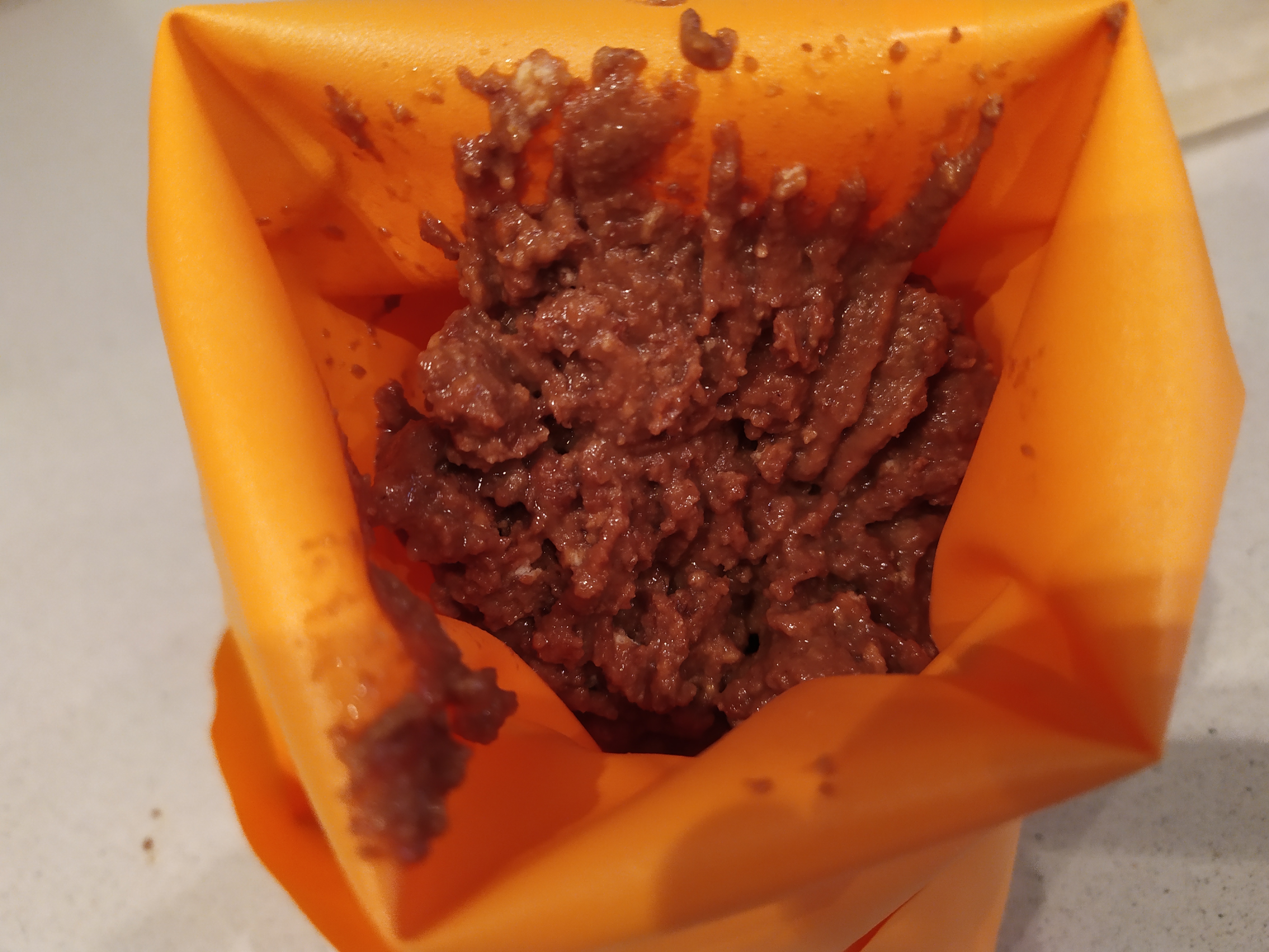 -colocamos la mezcla en una manga pastelera sin boquilla o con una redonda ancha, ya que la masa es espesa y luego cuesta de salir