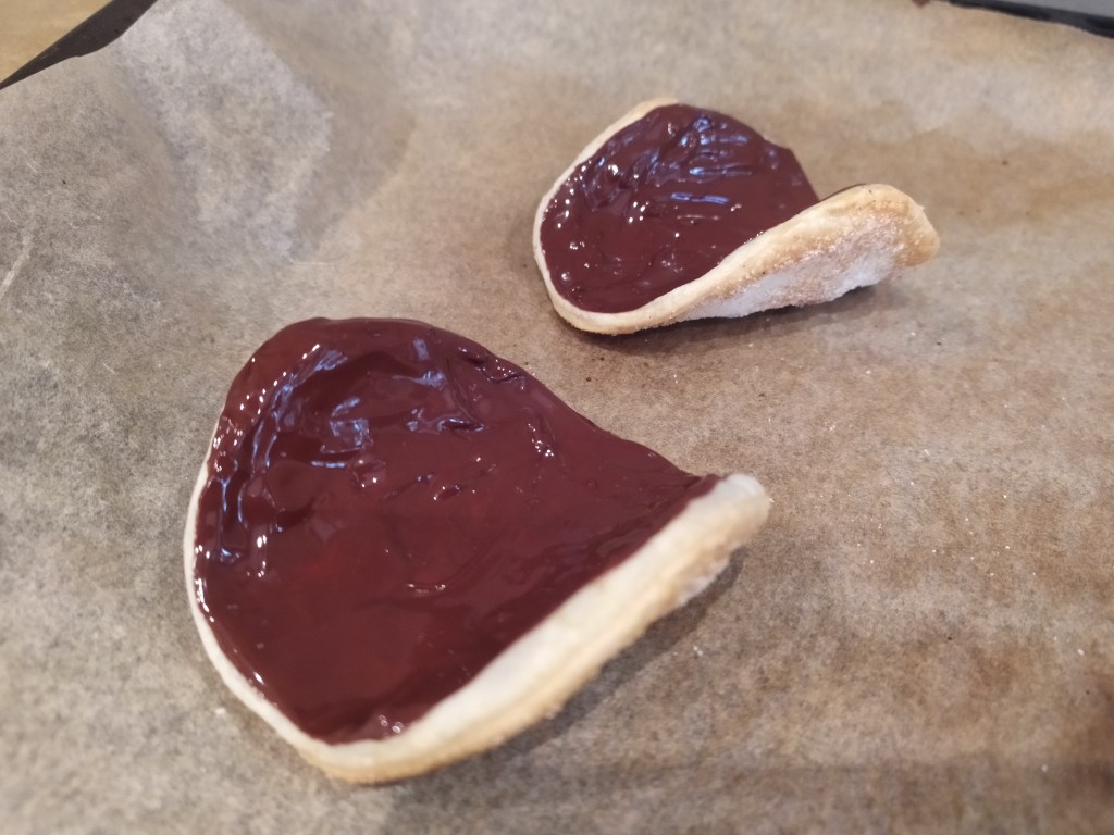 -cuando ya tengamos las tejas horneadss (yo las he hecho de dos en dos), dejamos enfriar y pintamos el interior con un poco de chocolate fundido, que dejamos enfriar