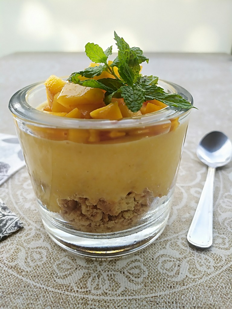 Estoy empezando a descubrir el potencial que tiene el melocotón en la repostería. Es una fruta que me gusta mucho, pero no había hecho postres con este ingrediente. Además del sabor que aporta, también destacaría su textura y color. Esta receta que publico hoy y he hecho con Rafa es sencillita por si un día queréis merendar algo sano, sabroso y refrescante o para un postre ligero. Como base solo lleva galletas y avellanas picadas, que como servimos en un vaso no he mezclado con mantequilla ni he picado del todo, para que queden trocitos. Encima lleva el melocotón cocinado al fuego con un poco de azúcar, que después mezclamos con un yogur de melocotón y unas láminas de gelatina para que tenga un poco de consistencia. Lo podemos decorar con unos trozos de melocotón natural y unas hojitas de menta.