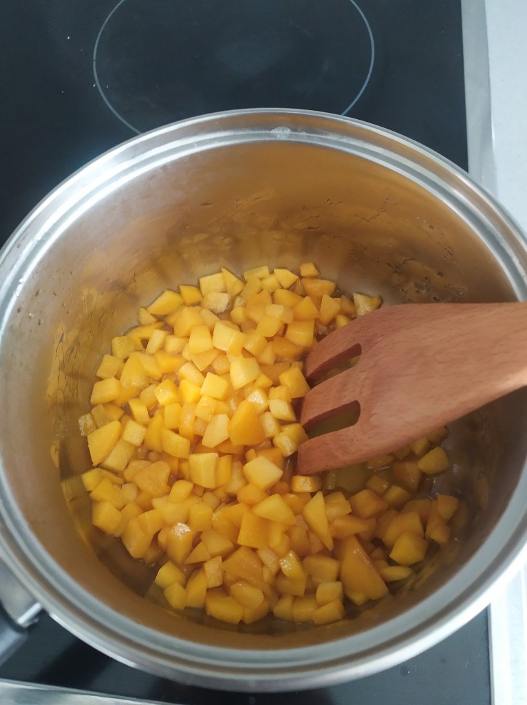 -empezamos pelando los melocotones y troceándolos a daditos pequeños