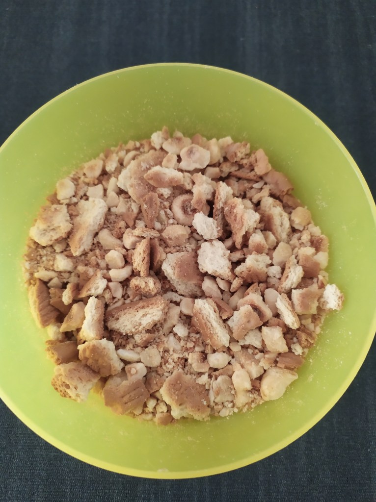 -colocamos las galletas y las avellanas en una bolsa y las chafamos con una maza para que queden troceadas (si queremos una textura más arenosa y fina, las podemos picar en la picadora)