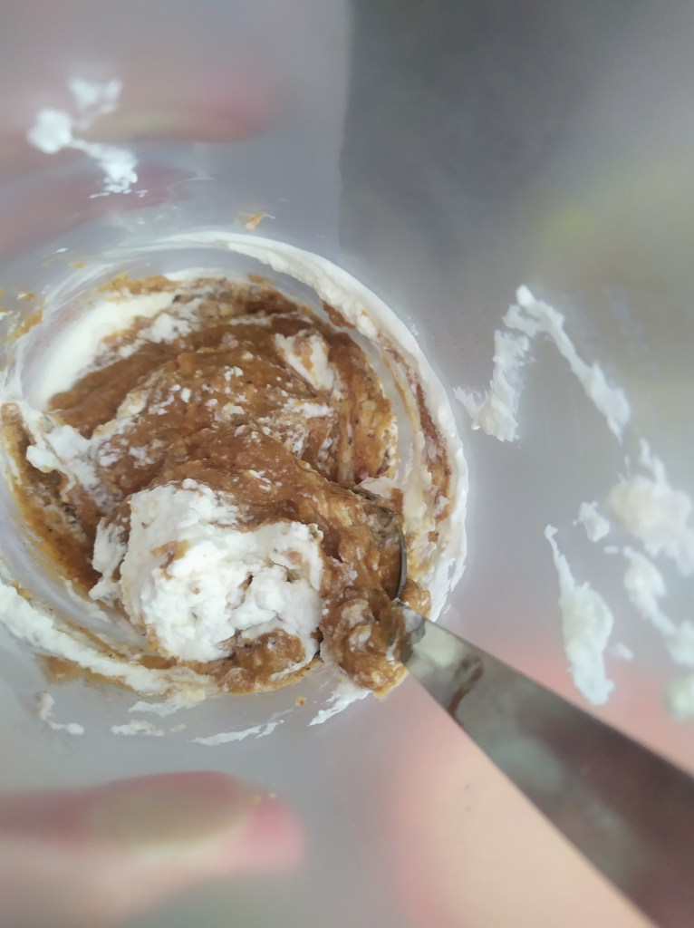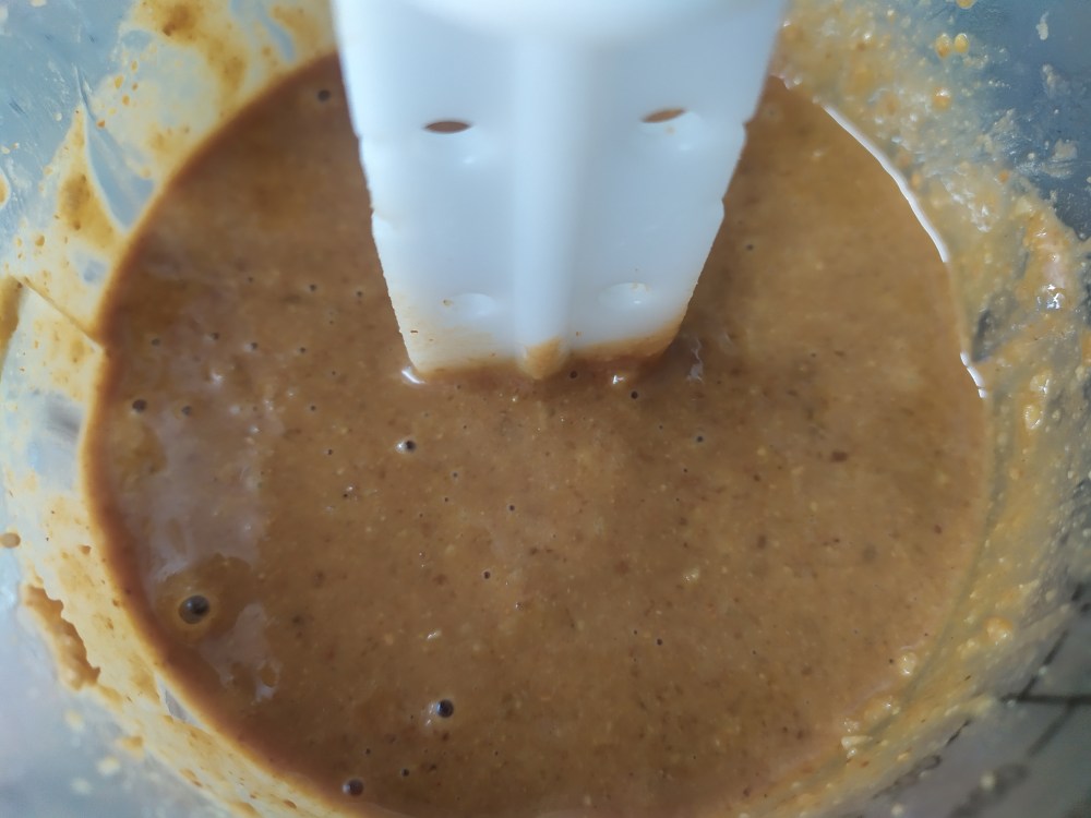 -rompemos el bloque y lo colocamos en una picadora y trituramos bien hasta que obtengamos una textura cremosa. Hay que picar bien durante bastante rato hasta que consigamos una crema. Reservamos