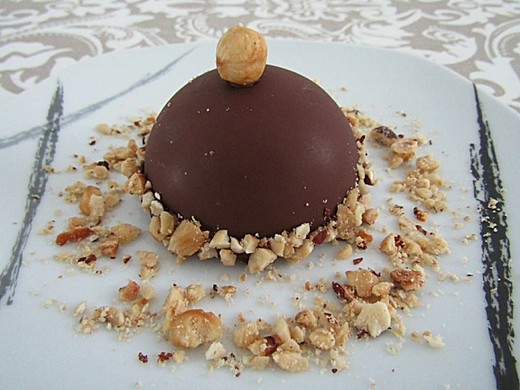 -nos queda el toque final y la decoración del postre, para acabar de redondearlo. Primero, desmoldamos las semiesferas y las decoramos con avellanas troceadas. Colocamos un poco de chocolate fundido en la parte inferior de las semiesferas (actúa como pegamento) y por encima vamos colocando trocitos de avellanas. Por último, utilizamos una avellana entera o media para colocarla en la parte superior de la semiesfera.
