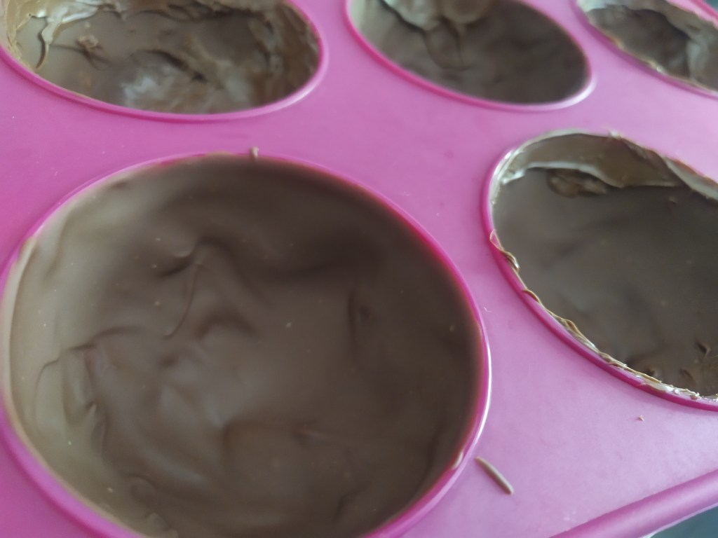 -empezamos derritiendo 90 gramos de chocolate con leche para hacer las semiesferas. Cuando tengamos el chocolate fundido, cubrimos los moldes (le podemos aplicar un par de capas finitas). Dejamos enfriar en la nevera