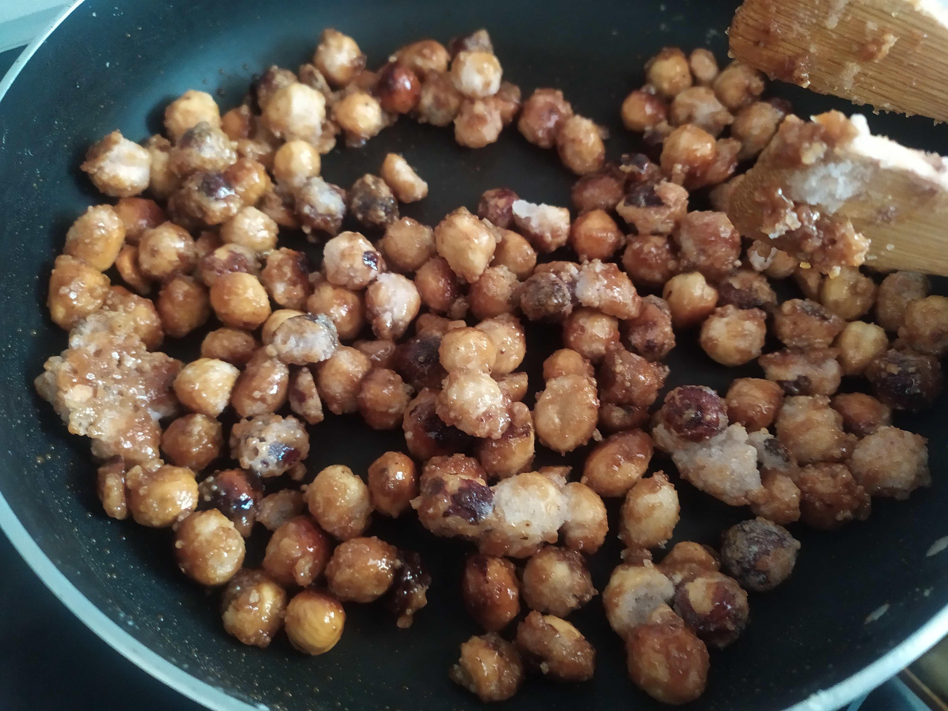 -vamos mezclando durante un rato hasta que obtengamos un caramelo y el azúcar coja color. Veréis que primero el azúcar se endurece, pero luego con el calor y un poco de agua (añadimos una cucharada) se vuelve a caramelizar. Removemos hasta que veamos que queda como las almendras garrapiñadas. Este proceso tarda bastante rato