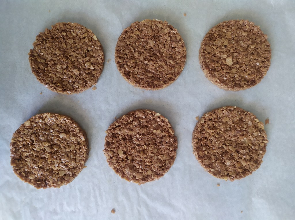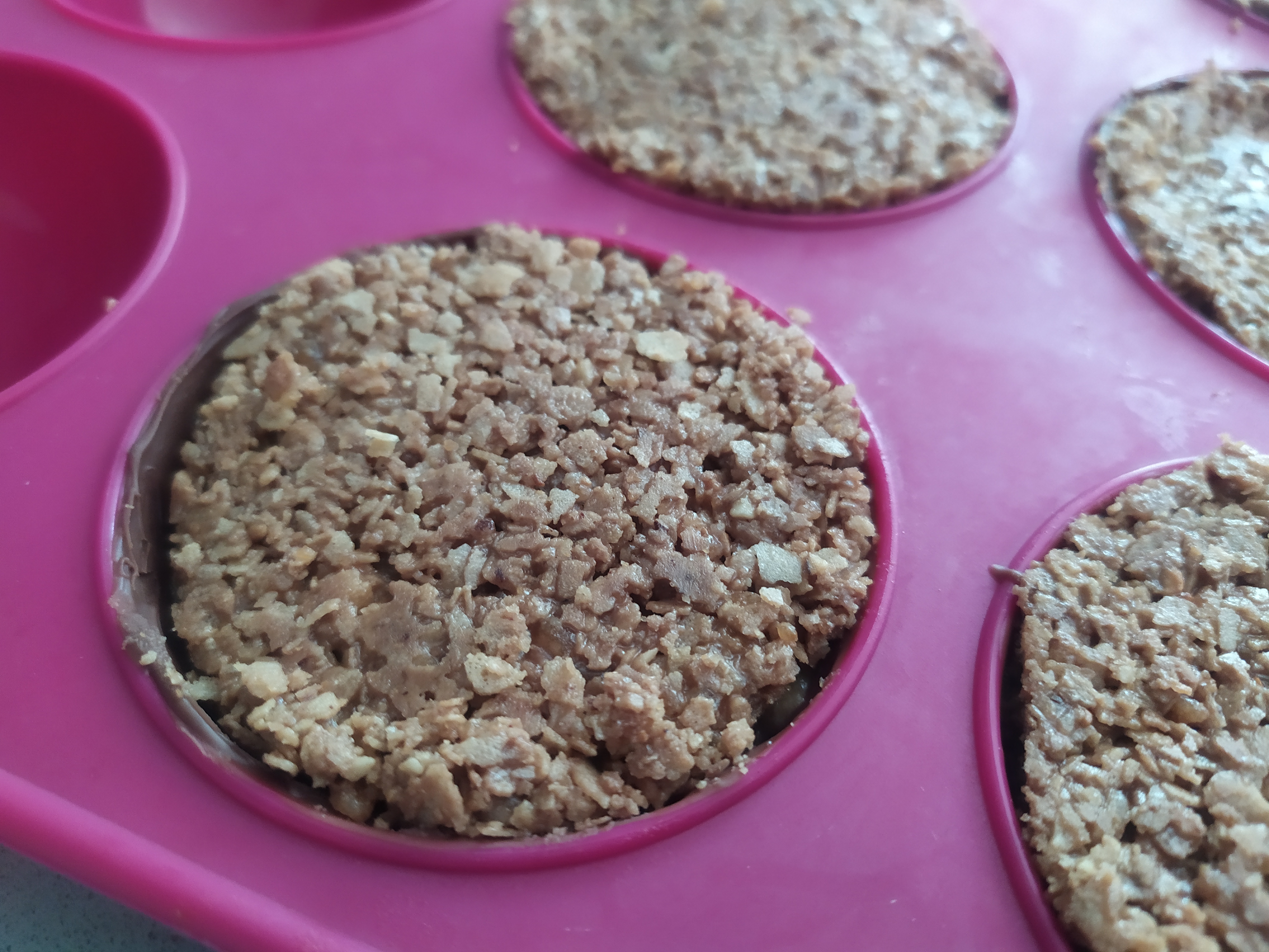 -mezclamos bien todos los ingredientes y preparamos con la ayuda de un cortador (del mismo tamaño de las semiesferas) las 6 bases del postre. Chafamos bien con la mano para que quede una base compacta y dejamos enfriar en la nevera