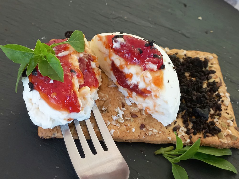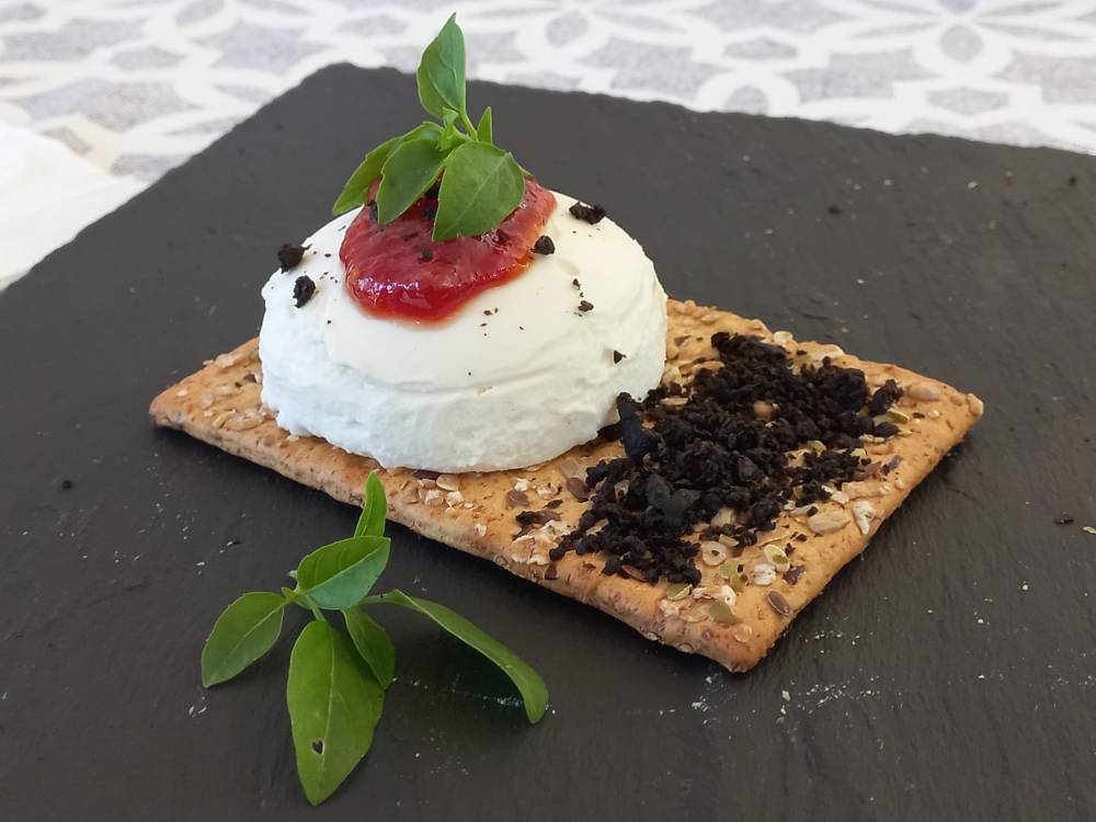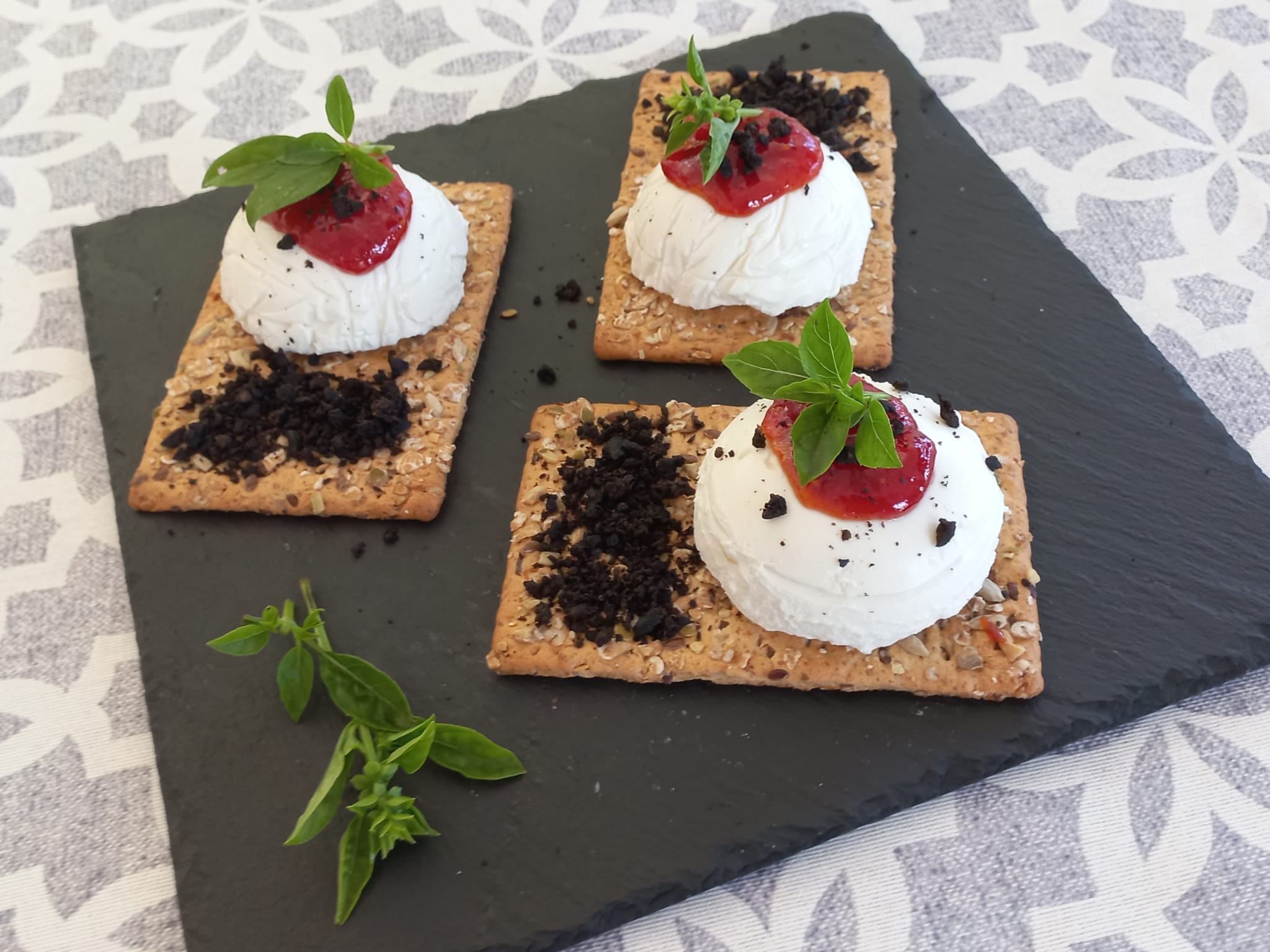 Vi en Pinterest una receta salada de semiesferas que me llamó la atención. Me quedé con la idea y hemos hecho una versión que nos ha sorprendido mucho: semiesferas de queso de cabra con mermelada de tomate sobre crackers acompañadas de tierra de olivas negras. Reconozco que tenía mis dudas a medida que la preparábamos, ya que no sabía qué textura tendría, si se podría desmoldar bien, si no quedaría muy empalagosa… pero la verdad es que quedó genial. Además, mi madre preparó previamente la mermelada de tomate en casa, que está buenísima. La combinación de pan tostado, con queso de cabra, tomate, olivas negras y albahaca no puede fallar. Le comenté a mi madre la idea que tenía y a ella se le ocurrió acompañarlo con olivas negras y crackers. Luego, cuando lo estábamos sirviendo, Rafa pensó que le faltaba el toque verde de la albahaca. El resultado: una tapa muy vistosa y sabrosa, que da mucho juego.