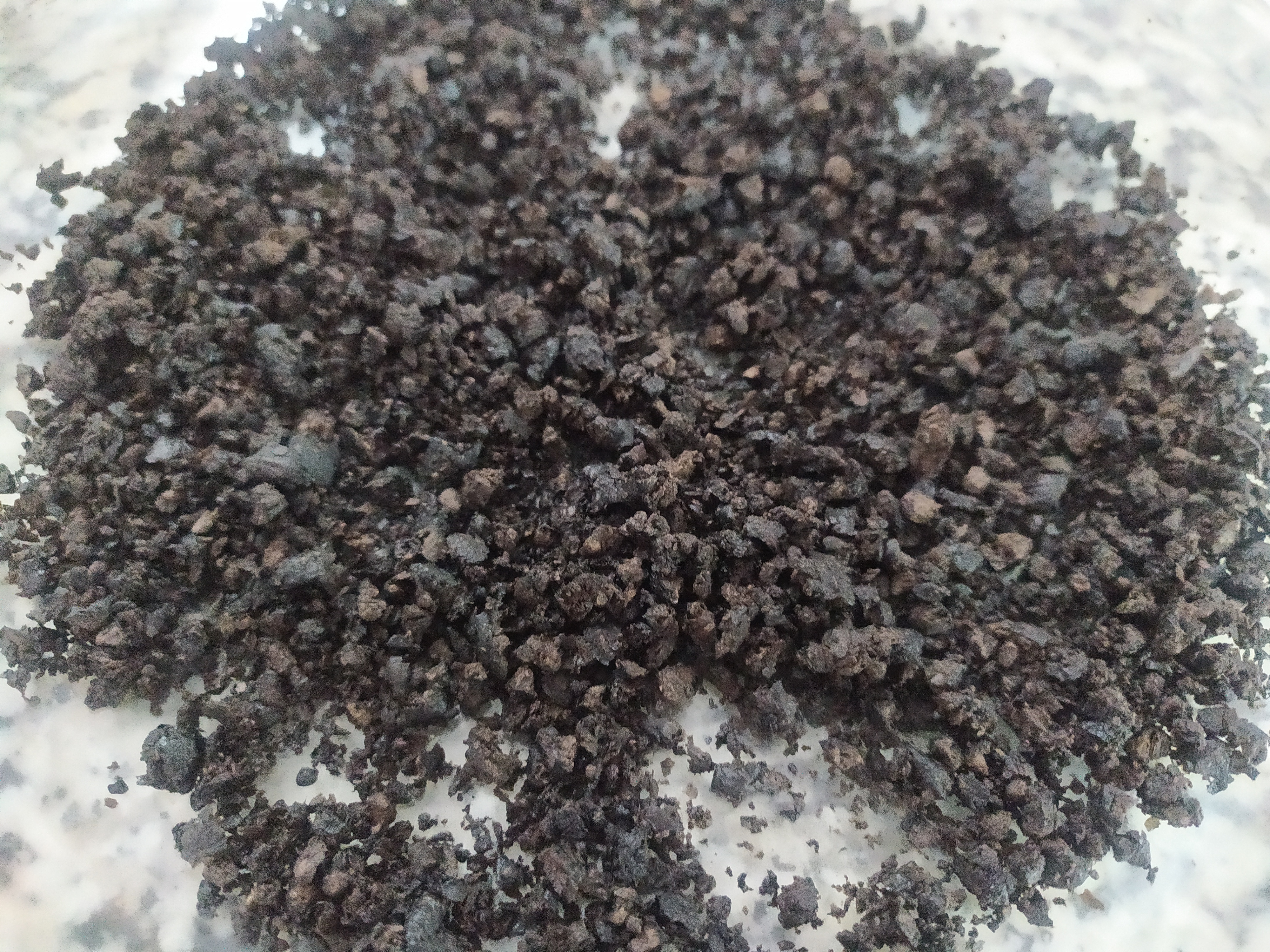 -mientras, preparamos la tierra de olivas. Es tan sencillo, como escurrir y secar las olivas negras sin hueso. Las colocamos extendidas en un plato y calentamos en el microondas hasta que se sequen y queden duras. Cuando estén deshidratadas, las picamos en la picadora hasta obtener una especie de tierra. Si vemos que están un poco tiernas, podemos extendelas en un plato y volver a calentar unos minutos más