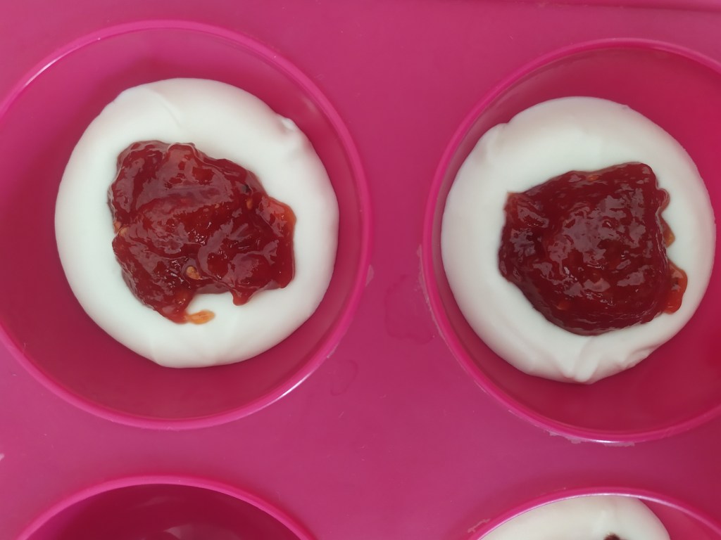 -cuando esté un poco cuajada, colocamos en el centro un poco de mermelada de tomate y cubrimos el resto con más crema de queso. Volvemos a dejar cuajar en la nevera hasta la hora de servir