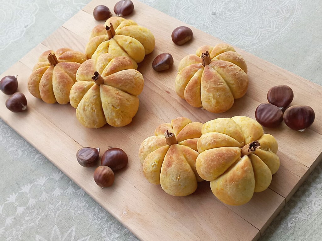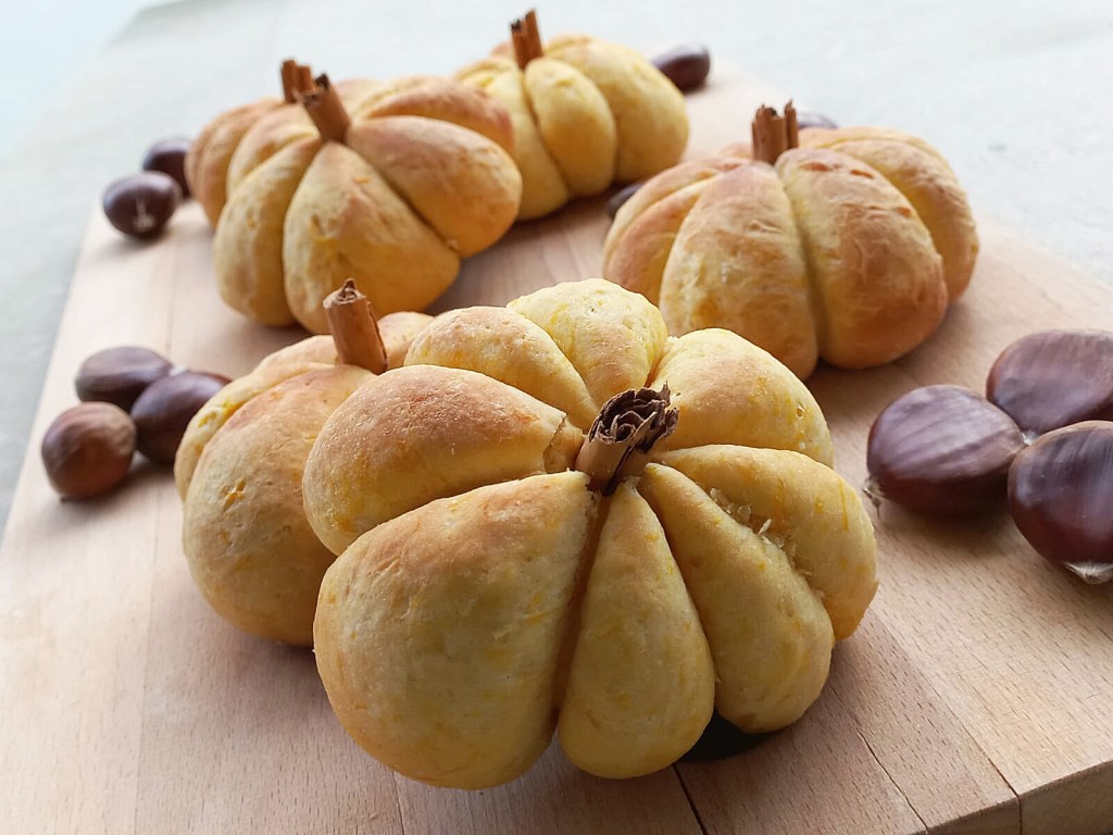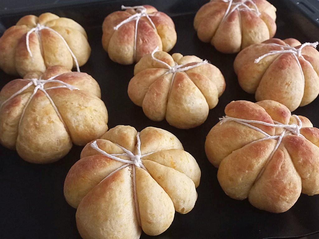 Para estas fechas, cada año pienso en hacer pan con forma de calabaza, pero entre unas cosas y otras no lo había preparado hasta ahora. No solo tiene la forma, sino que es una masa dulce elaborada con calabaza, que está buenísima y es muy esponjosa. El resultado han sido estos bollitos que son ideales para comer con un poco de chocolate, aunque solos están buenísimos. Qué mejor momento para prepararlos en casa que ahora que se acerca Halloween. Os dejo la receta para preparar unos 8 bollitos. Para darles la forma, he utilizado cuerda de cocinar y luego a modo de decoración, les he añadido unos trocitos de canela en rama.