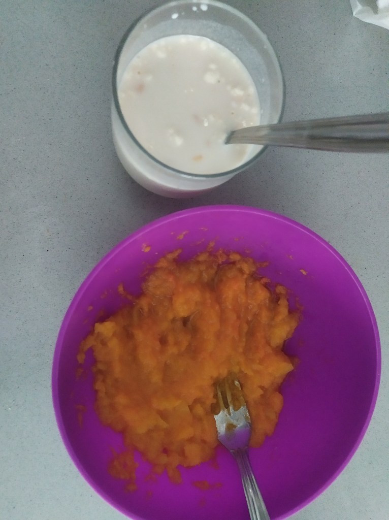 -una vez cocida la calabaza, cuando esté templada, la chafamos con un tenedor hasta obtener un puré. Reservamos