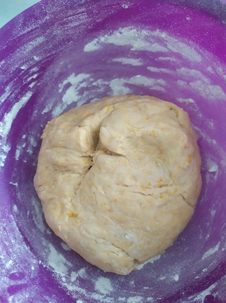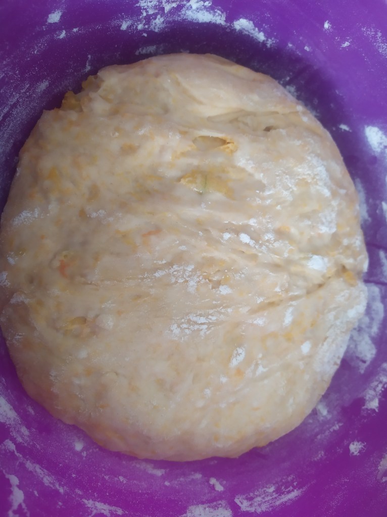 -mientras, en un bol, colocamos la harina de fuerza y la sal (2 cucharaditas). Hacemos un hueco en el medio y añadimos el huevo, el puré de calabaza, la leche con la levadura y el azúcar y el aceite. Removemos bien y trabajamos la masa con las manos hasta que no se nos pegue