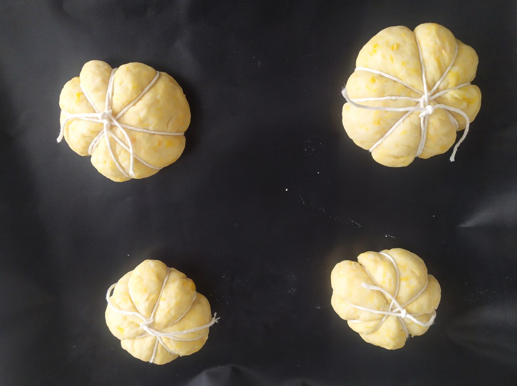 -hacemos porciones (salen 8 bollitos) y las atamos con una cuerda de cocina para darles forma de calabaza