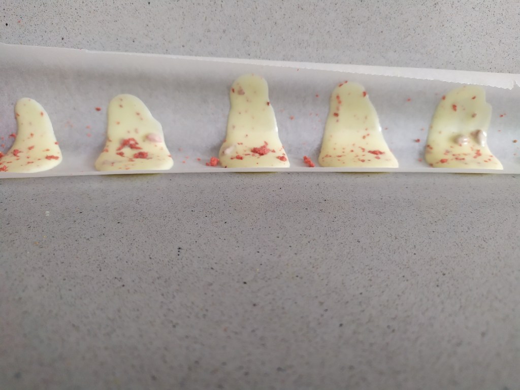-podemos derretir en el microondas unos trocitos de chocolate. Con la ayuda de una cucharita, hacemos lágrimas en un papel de horno. Le añadimos por encimo unos trocitos de fresas liofilizadas previamente machacadas (se queda como un polvito). Lo colocamos en un lado de la nevera para que cojan forma ondulada. Dejamos enfriar hasta la hora de servir
