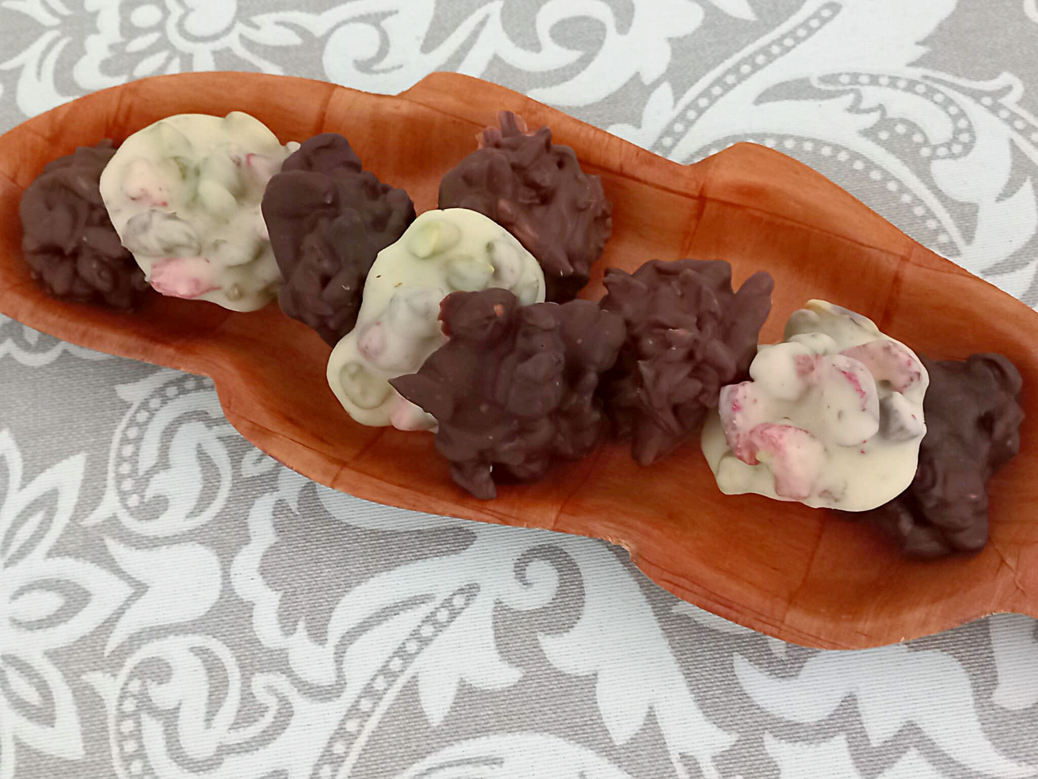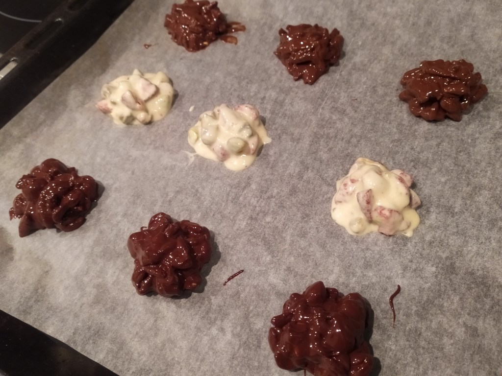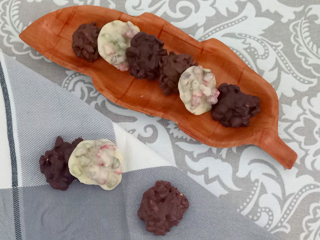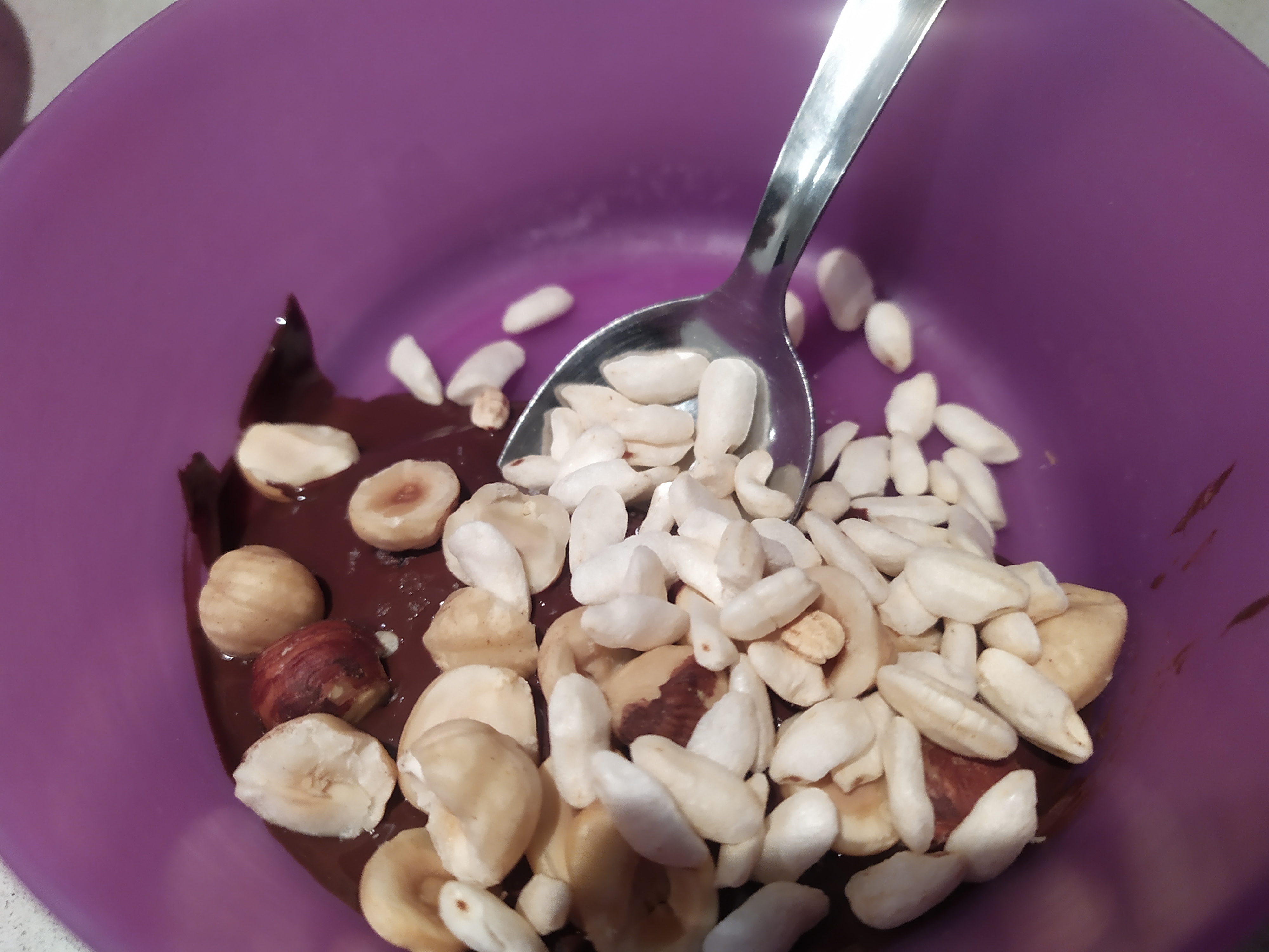 Esta ha sido una receta de aprovechamiento en toda regla. Tenía chocolate en la nevera (blanco, con leche y negro), ya que siempre me gusta tener por si quiero hacer algún postre. Además, me quedaban algunos frutos secos (almendra laminada, avellanas tostadas y pistachos). También tenía arroz inflado, que compré un paquete para preparar una receta y me sobró bastante cantidad. Con estos ingredientes he preparado unas rocas de chocolate y frutos secos. He hecho varias combinaciones, pero podéis prepararlo con lo que tengáis en casa (cereales, frutos secos, arándanos…). Son un vicio cuando tenéis antojo de algo dulce, es un snack que no dura muchos días, se acaba rápido.