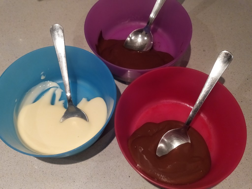 -colocamos los diferentes tipos de chocolate en cuencos distintos y los derretimos (al microondas o al baño María)