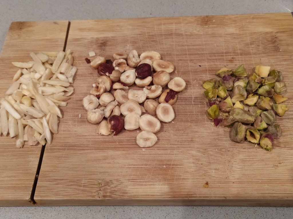 -por otro lado, troceamos un poco los frutos secos y las fresas liofilizadas