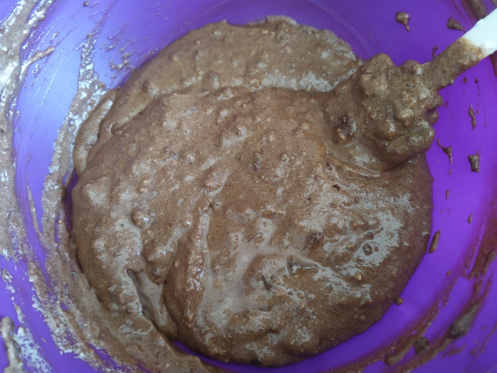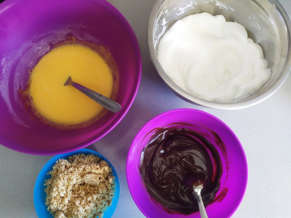 -mezclamos las avellanas picadas con el chocolate y mantequilla que hemos fundido, añadimos también las yemas y por último incorporamos las claras con movimientos envolventes. Mezclamos hasta que tengamos una masa homogénea