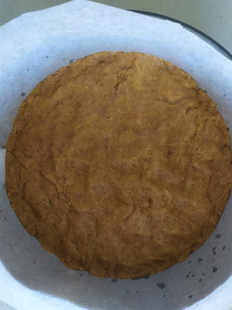 -mezclamos las galletas trituradas con el zumo de naranja y extendemos en la base de nuestro molde y aplastamos bien con la mano