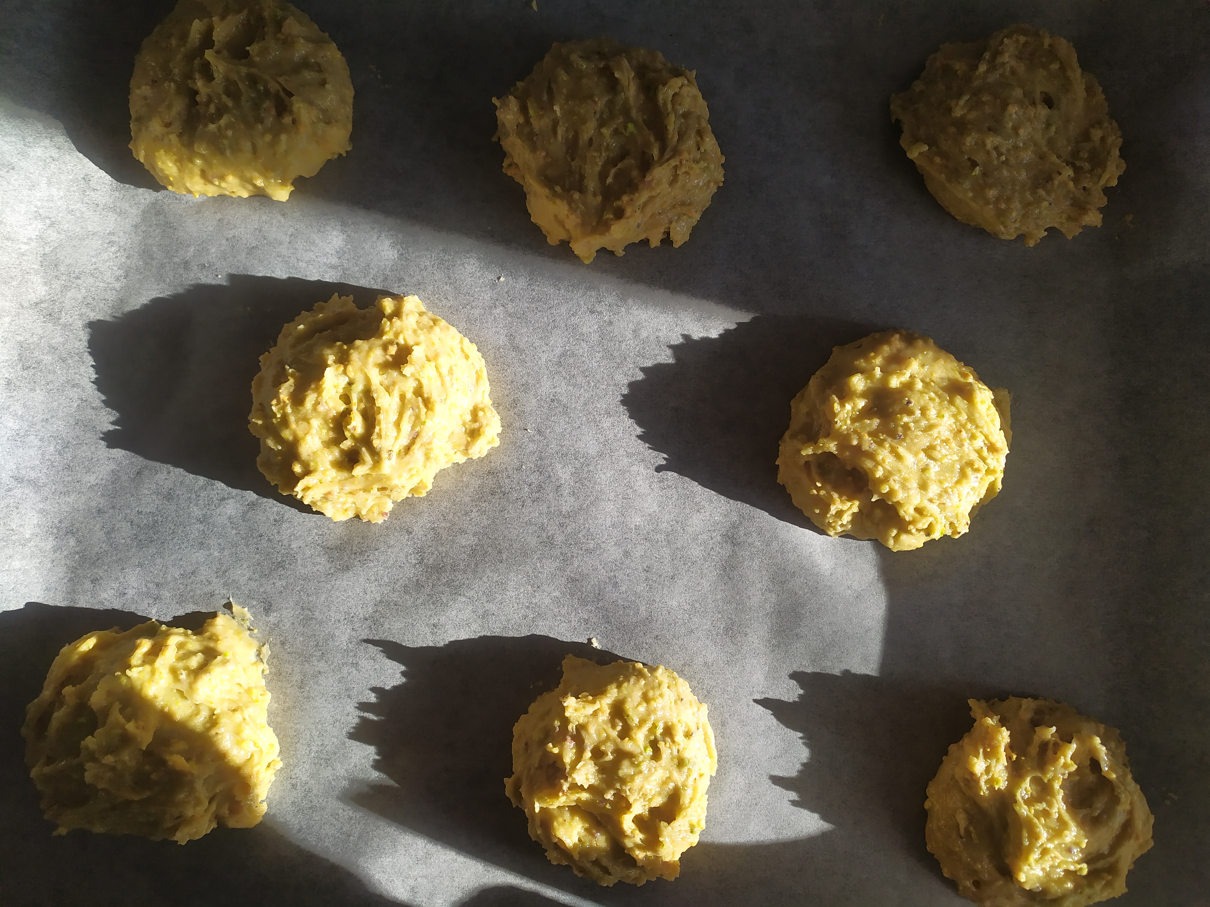 -con la ayuda de una cuchara, colocamos bolitas en una bandeja de horno y las chafamos para darles forma
