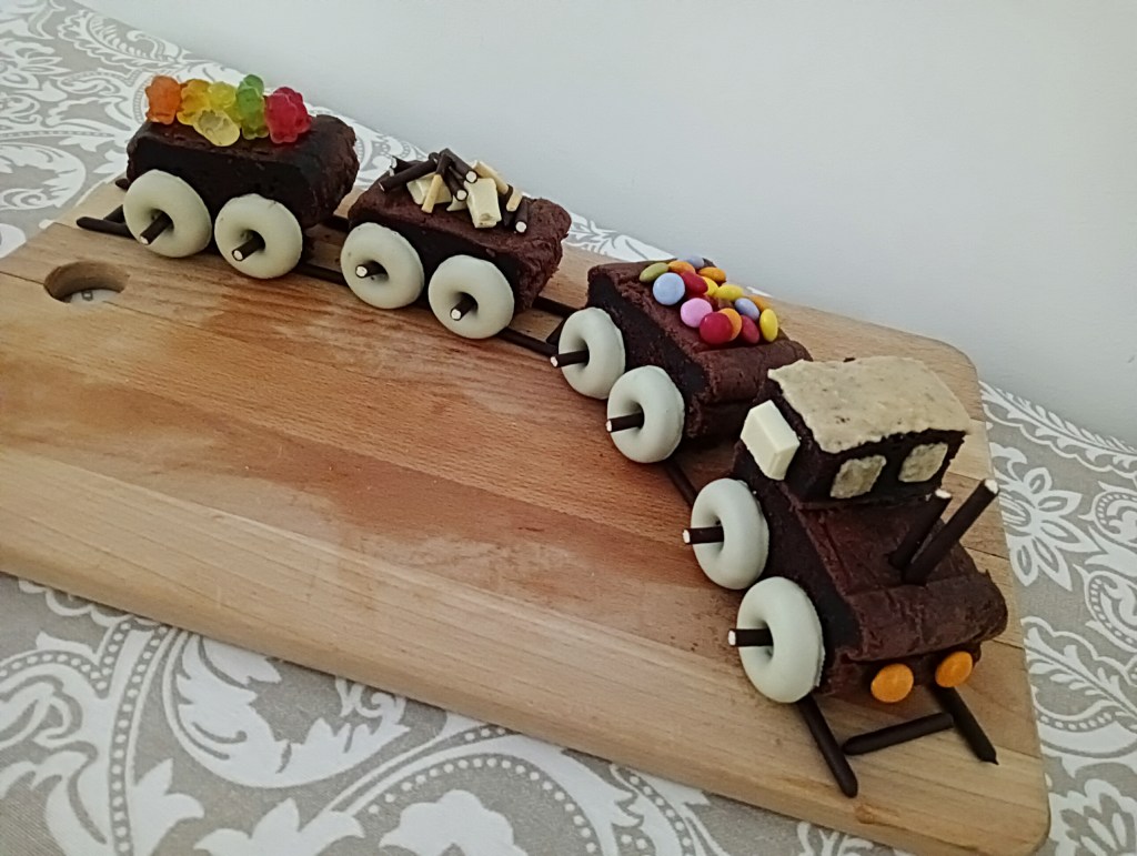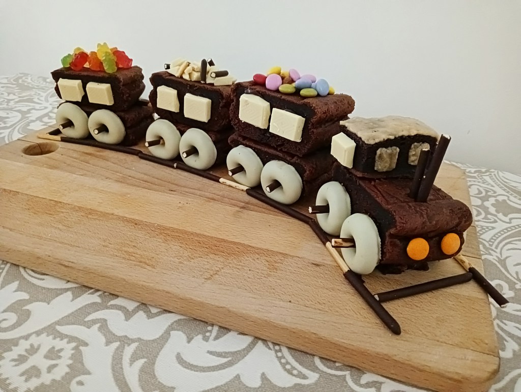 Este año, para el cumpleaños de Rafa le he preparado una tarta diferente, que tiene como base un bizcocho de chocolate. Aunque pueda parecer complicada, es mucho más fácil de lo que aparenta y sólo se requiere un poco de paciencia para decorarla. Como aficionado a los trenes que es y ahora como maquinista, he decidido hacerle un pastel en forma de tren, una idea que podéis aprovechar si queréis preparar una mona diferente. Para la base podéis hacer un bizcocho de lo que queráis (mermelada, yogur…), yo he optado por uno de chocolate para que quede negro, y sólo necesatáis un molde alargado para que luego sea más fácil darle la forma y recortarlo. Si preparáis un bizcocho sale un tren de un piso, pero si lo queréis hacer de dos pisos, es tan sencillo como preparar dos bizcochos. Además, da mucho juego, ya que lo podéis decorar con lo que más os guste (galletas, chocolate, Lacasitos, gominolas…). El chocolate hace de pegamento y le podéis poner tantas cosas como queráis. Si os gusta la cocina tanto como a mí, disfrutaréis preparándolo y haciéndolo a vuestro gusto.