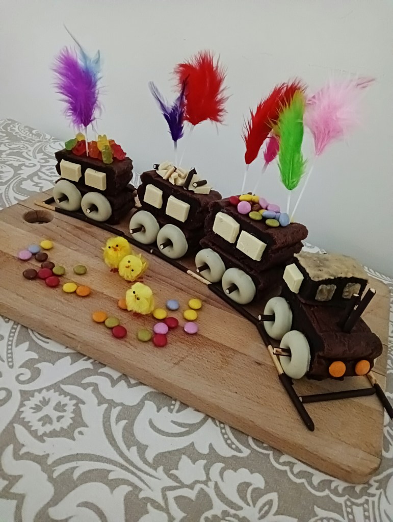 -por último, toca añadir arriba las mercancías, y para ello podéis colocar ositos de gominolas, trozos de chocolate y Mikados, Lacasitos… Lo que más os guste. Si la hacéis para la Mona, le podéis añadir plumas, pollitos, huevos…