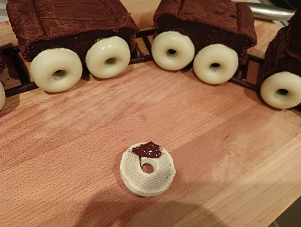 -lo primero que he hecho ha sido pegar las ruedas; para ello, fundimos el chocolate y lo colocamos en los Filipinos, que los pegamos en la parte de abajo del bizcocho (2 por cada vagón). En en agujero de cada Filipino, podemos clavar un trozo de Mikado. Repetimos este paso en todos los vagones