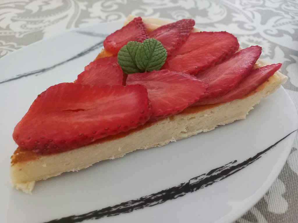 -dejamos enfriar la tarta y a la hora de servir, la pintamos con el jarabe que hemos preparado antes y laminamos las fresas para colocarlas por encima. La podemos decorar con unas hojas de menta o añadirle también mermelada