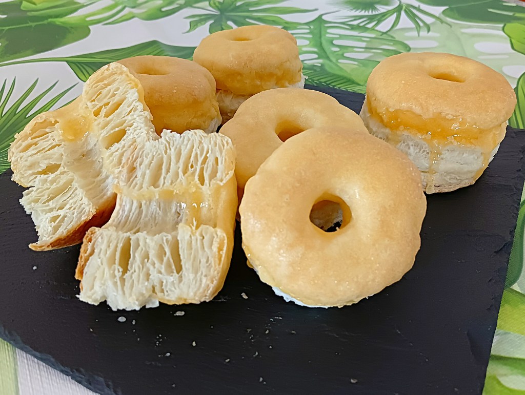 -las cortamos con forma de rosquillas (yo he utilizado un molde de aro y un descorazonador de manzanas, pero podéis utilizar un vaso y una boquilla de la manga pastelera o un tapón)