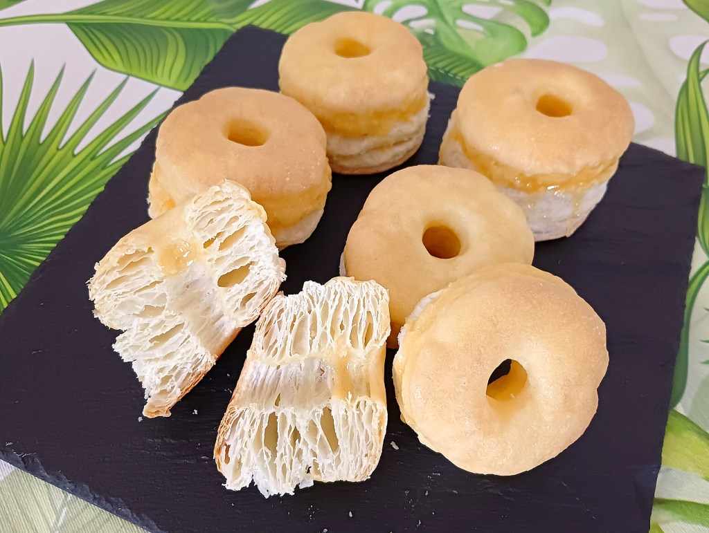 La otra noche empecé a ver la nueva edición de Masterchef y el primer postre que prepararon fueron estas rosquillas de Alcalá. Me llamaron la atención y las he hecho para el fin de semana. Es una receta muy sencilla, ya que como base lleva hojaldre (he comprado varias láminas) y luego van decoradas por encima con un glaseado de yemas (agua, azúcar y yemas) y un glaseado de azúcar (agua y azúcar glas). Lo único delicado de la receta es la primera parte del montaje del hojaldre, ya que es importante que a la hora de superponer las capas queden bien selladas por igual por todos los lados para que luego en el horno crezcan bien. Las rosquillas se pueden hacer de dos, tres o cuatro capas, dependiendo del grosor que queráis. Entre cada capa, yo he espolvoreado un poco de azúcar glas para que se peguen bien y luego a la hora de hornear las rosquillas, las he pulverizado con agua. Con la masa sobrante de los bordes y agujeros, la he estirado y he hecho más rosquillas, así que hemos aprovechado bien las láminas.