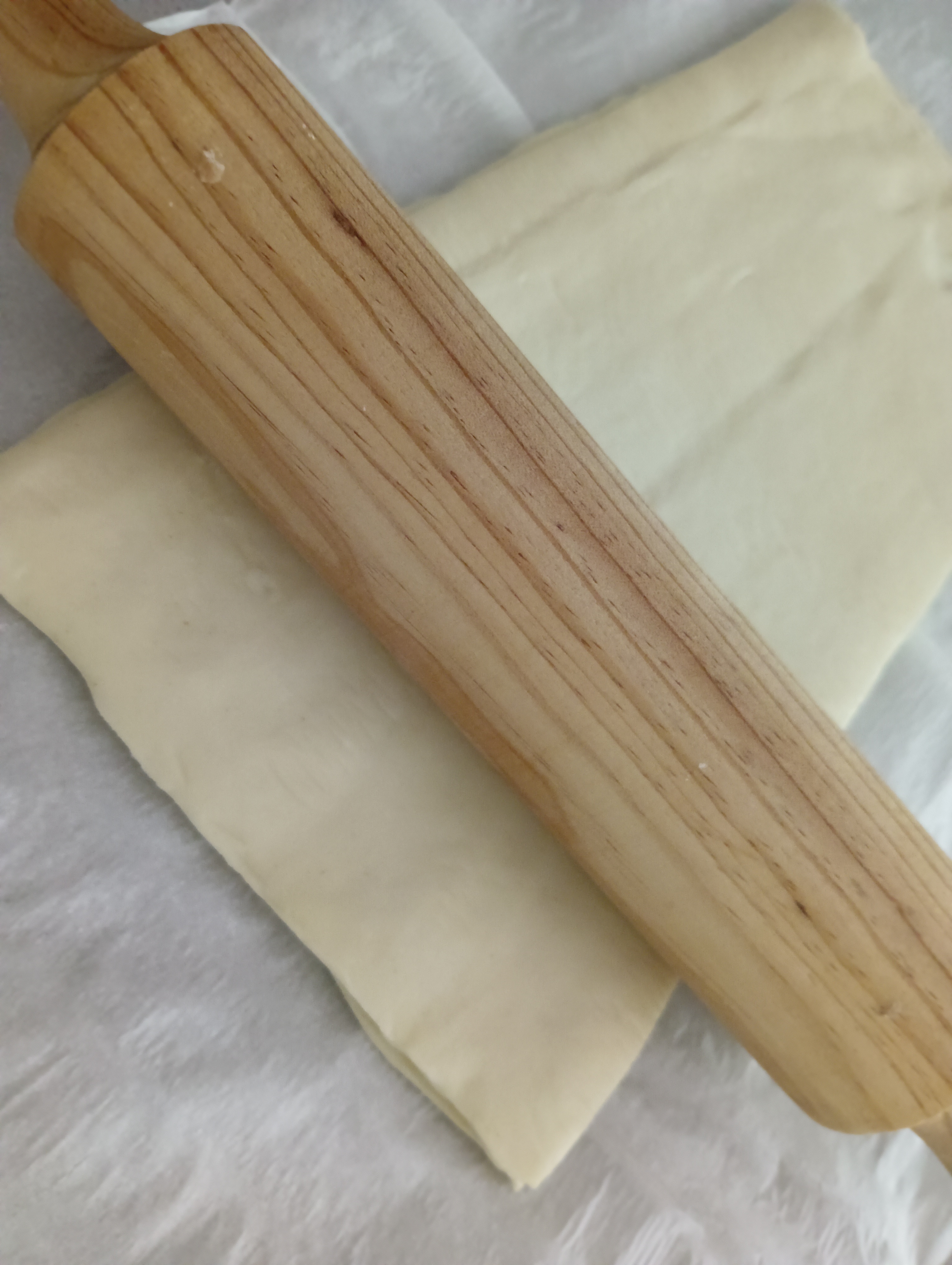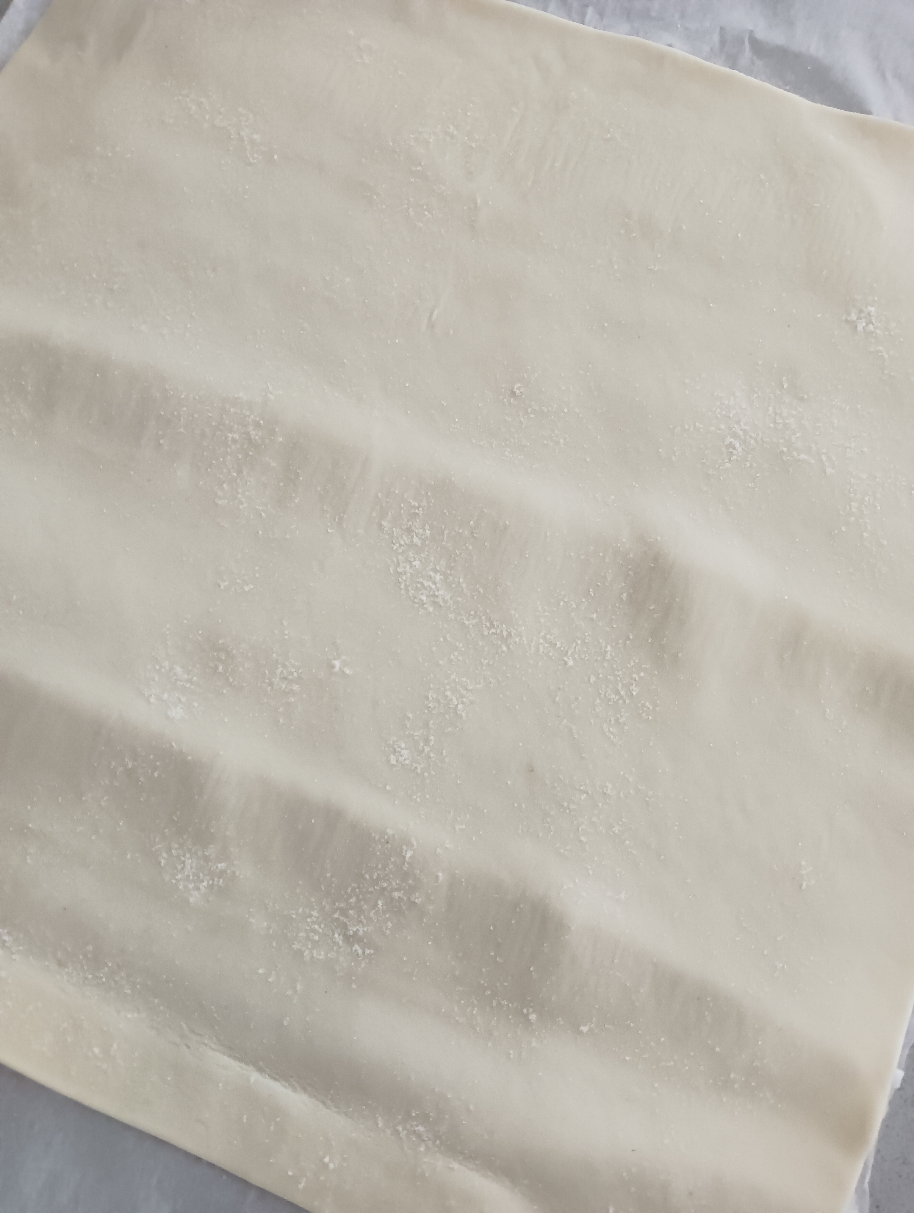 -empezamos estirando las láminas de hojaldre y espolvoreamos una con azúcar glas. Luego, colocamos la otra lámina encima. Si queréis hacerlas de 4 capas, ahora la partimos por la mitad y volvemos a espolvorear azúcar glas en una y colocamos la otra encima (ya tenemos las 4 capas de hojaldre montadas)