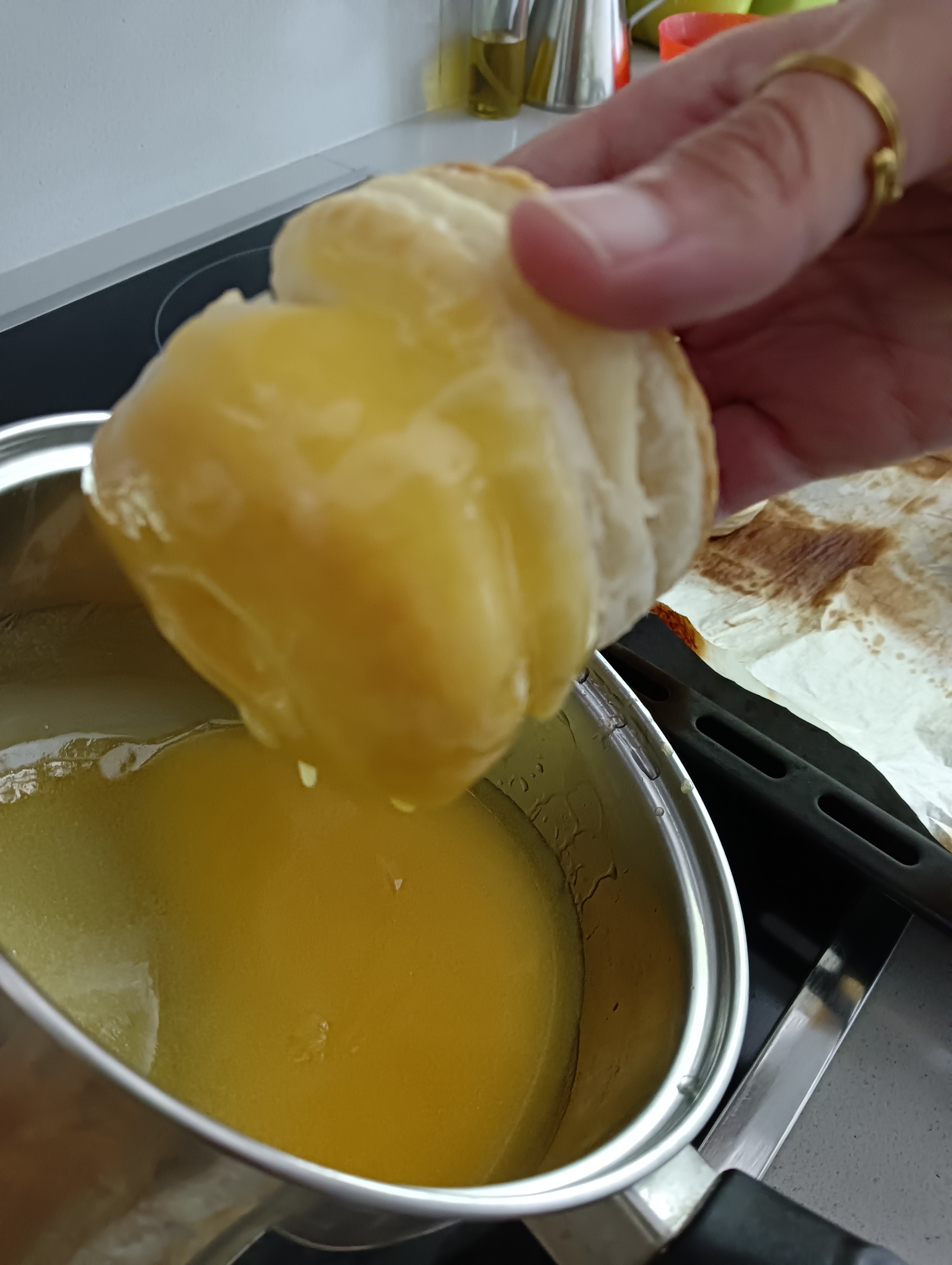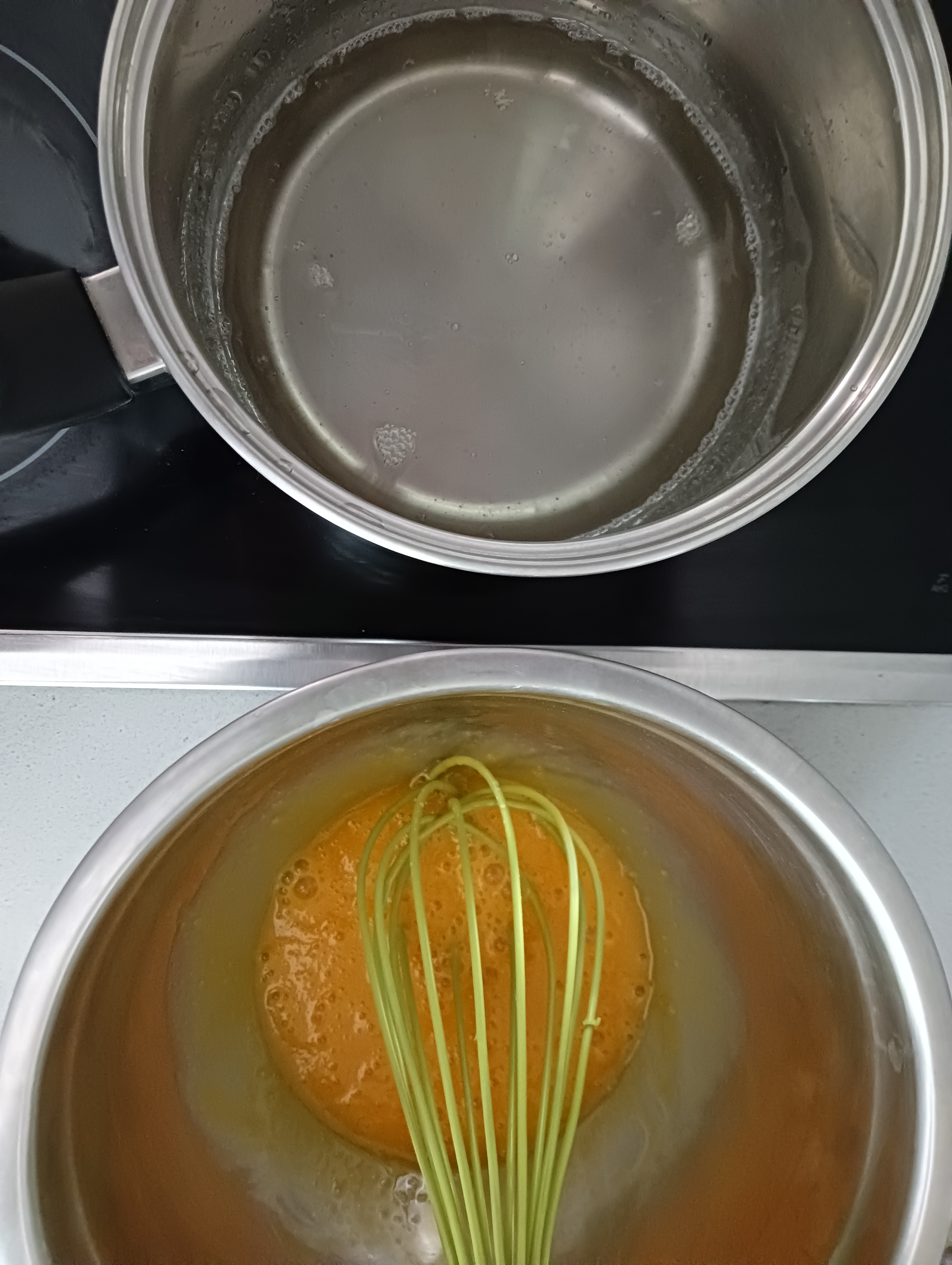 -mientras se hacen las rosquillas y luego las dejamos enfriar, preparamos el glaseado de yemas: por un lado, batimos 4 yemas; por otro, en una olla colocamos el agua y el azúcar y dejamos que hierva durante 3 minutos. Luego, retiramos del fuego y dejamos templar. Vamos añadiendo en hilo esta mezcla a las yemas sin dejar de remover para que no se cuajen. Volvemos a llevar la mezcla al fuego y removemos hasta que espese y obtengamos una crema (no tiene que llegar a hervir)