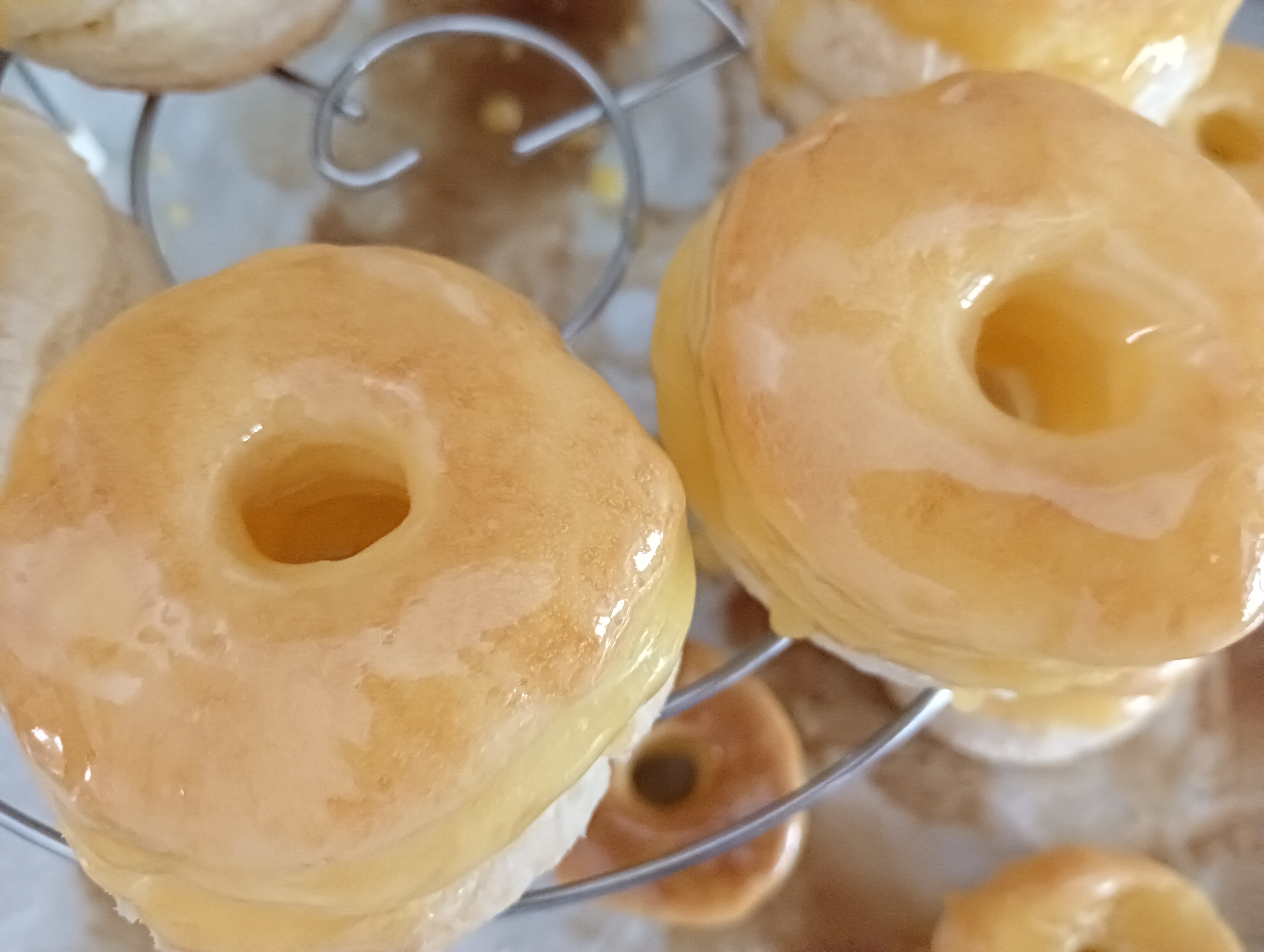 -dejamos que se temple y luego vamos bañando las rosquillas en el glaseado (hasta la mitad). Colocamos las rosquillas en una rejilla y dejamos que se seque la crema