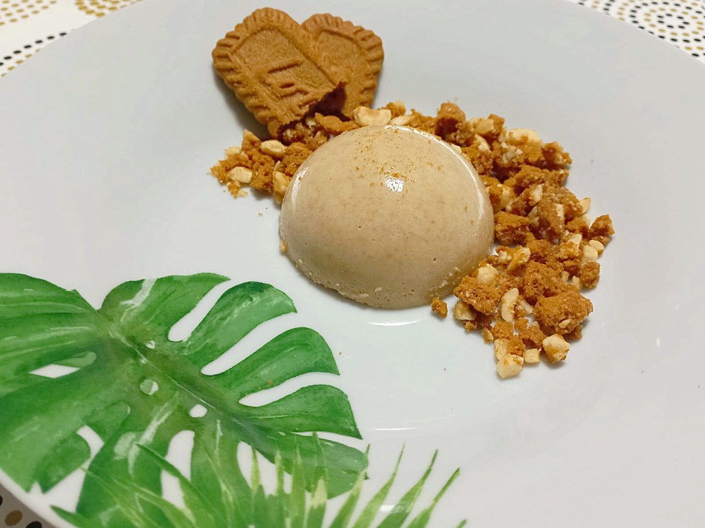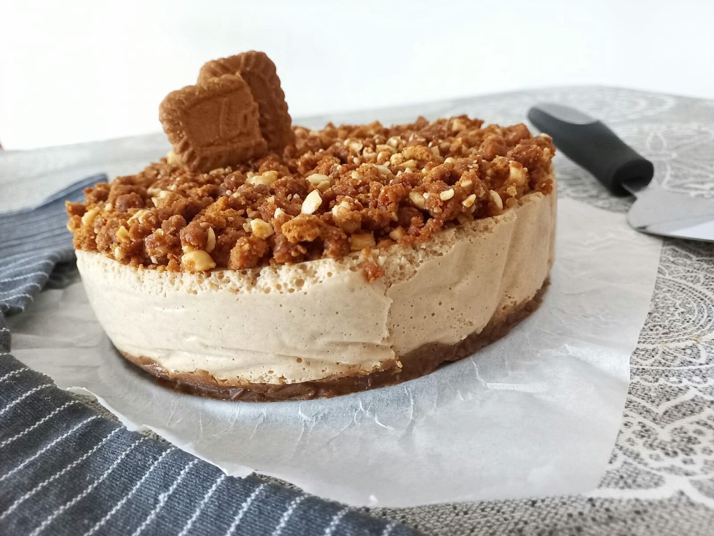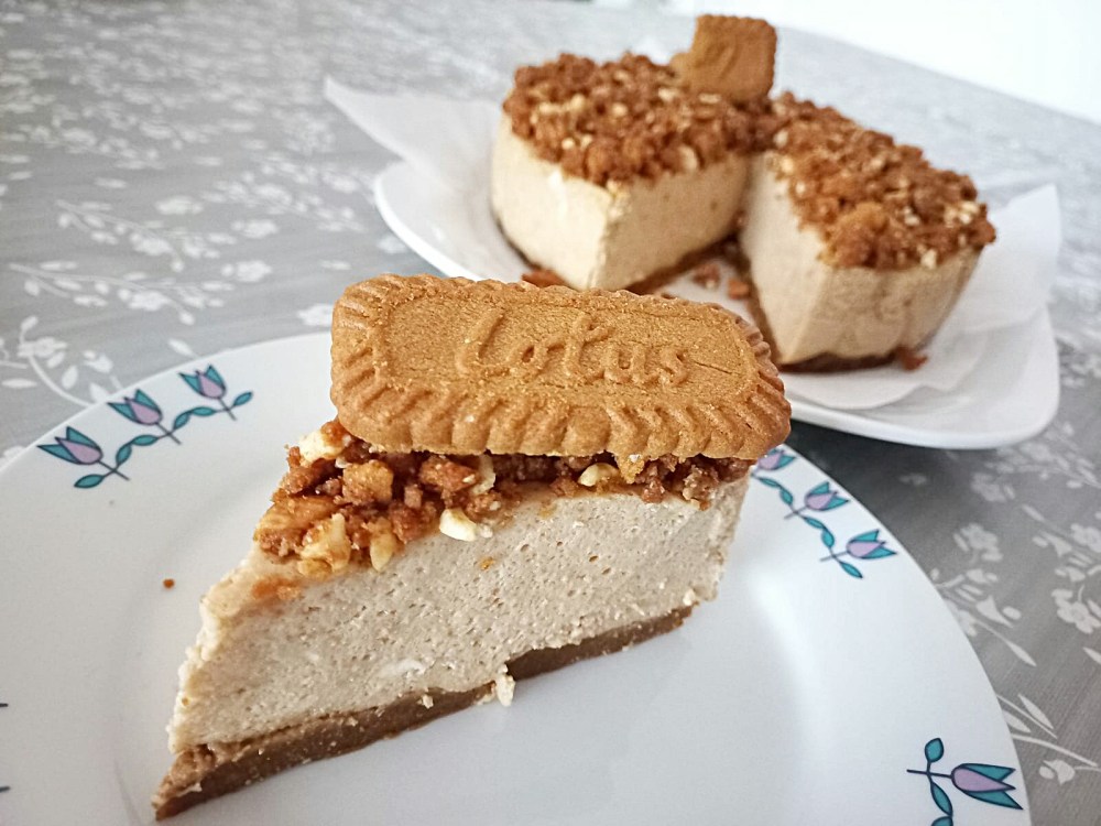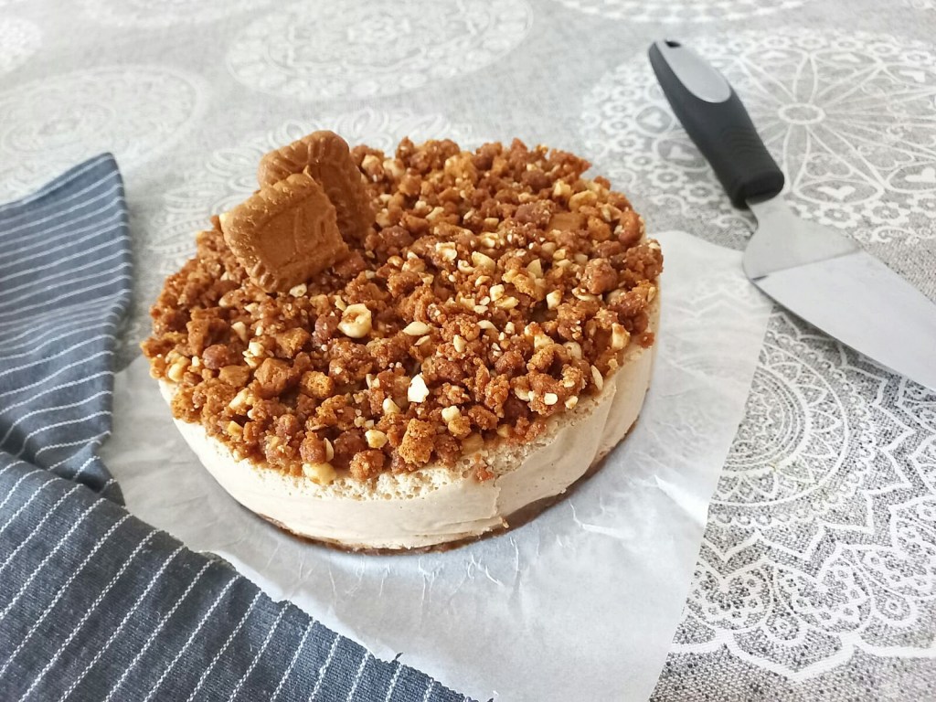 -cuando el relleno esté frío, colocamos por encima la capa de crumble y volvemos a dejar enfriar en la nevera. Antes de servir, desmoldamos la tarta y luego la acabamos de decorar con alguna galleta Lotus por encima