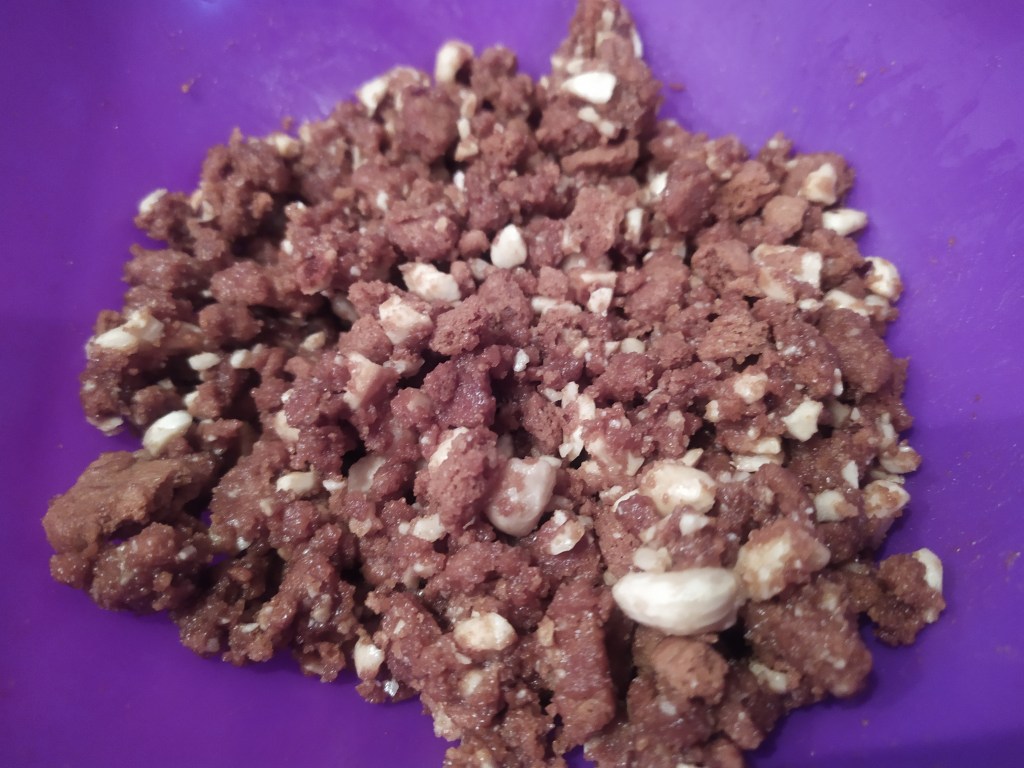 -mientras la tarta se enfría, preparamos el crumble: picamos en el mortero las avellanas y las galletas, para que queden trozos. Por otro lado, derretimos en el microondas la mantequilla y mezclamos con el resto de ingredientes. Lo hacemos con las manos hasta obtener una textura terrosa
