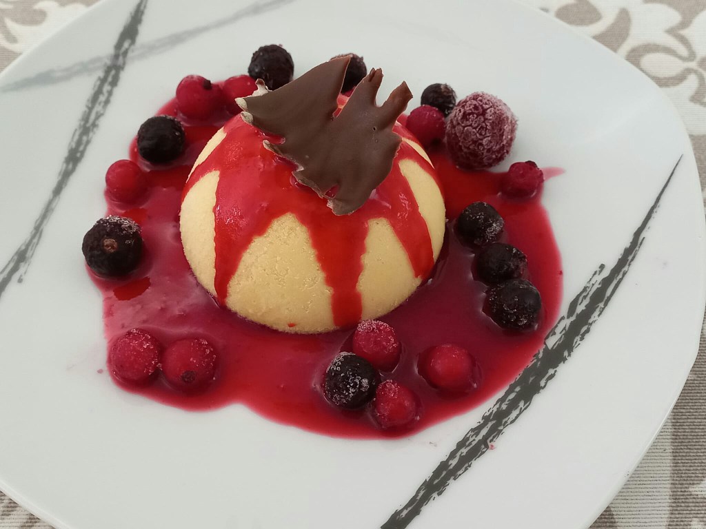 -a la hora de servir, desmoldamos las semiesferas y las acompañanos con nuestro coulis y si queremos, algunos frutos rojos