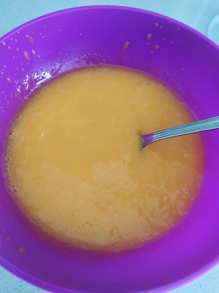 -empezamos pelando el mango y troceándolo. Lo trituramos junto con el zumo de media naranja y le añadimos el azúcar
