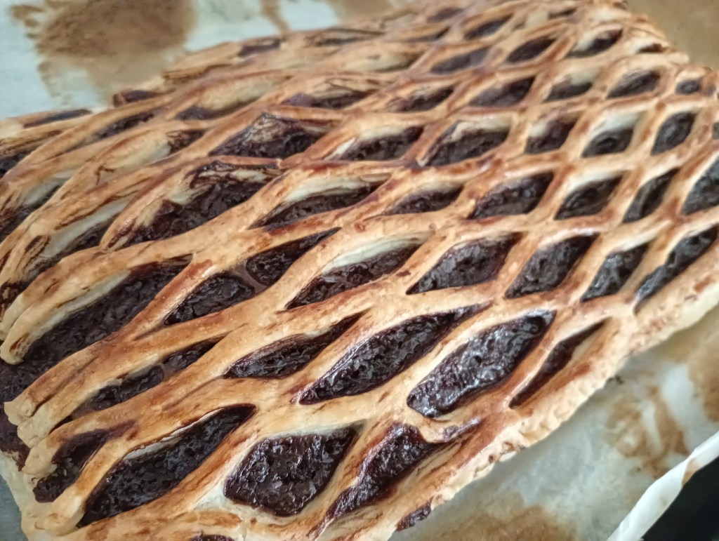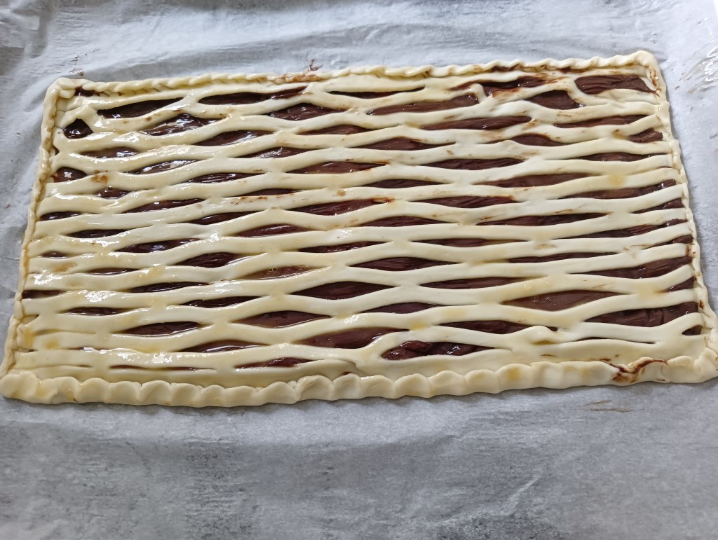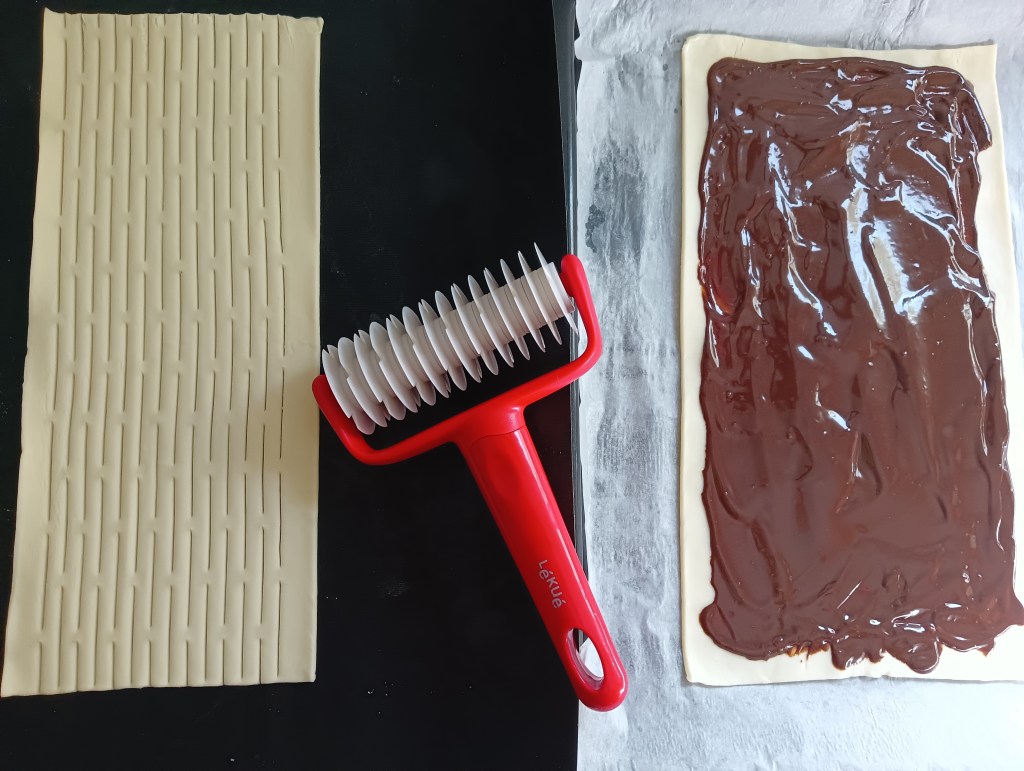 -con un rodillo especial, enrejamos el trozo de hojaldre más estrecho, que colocamos encima ayudándonos de un rodillo y abriendo un poco el enrejado