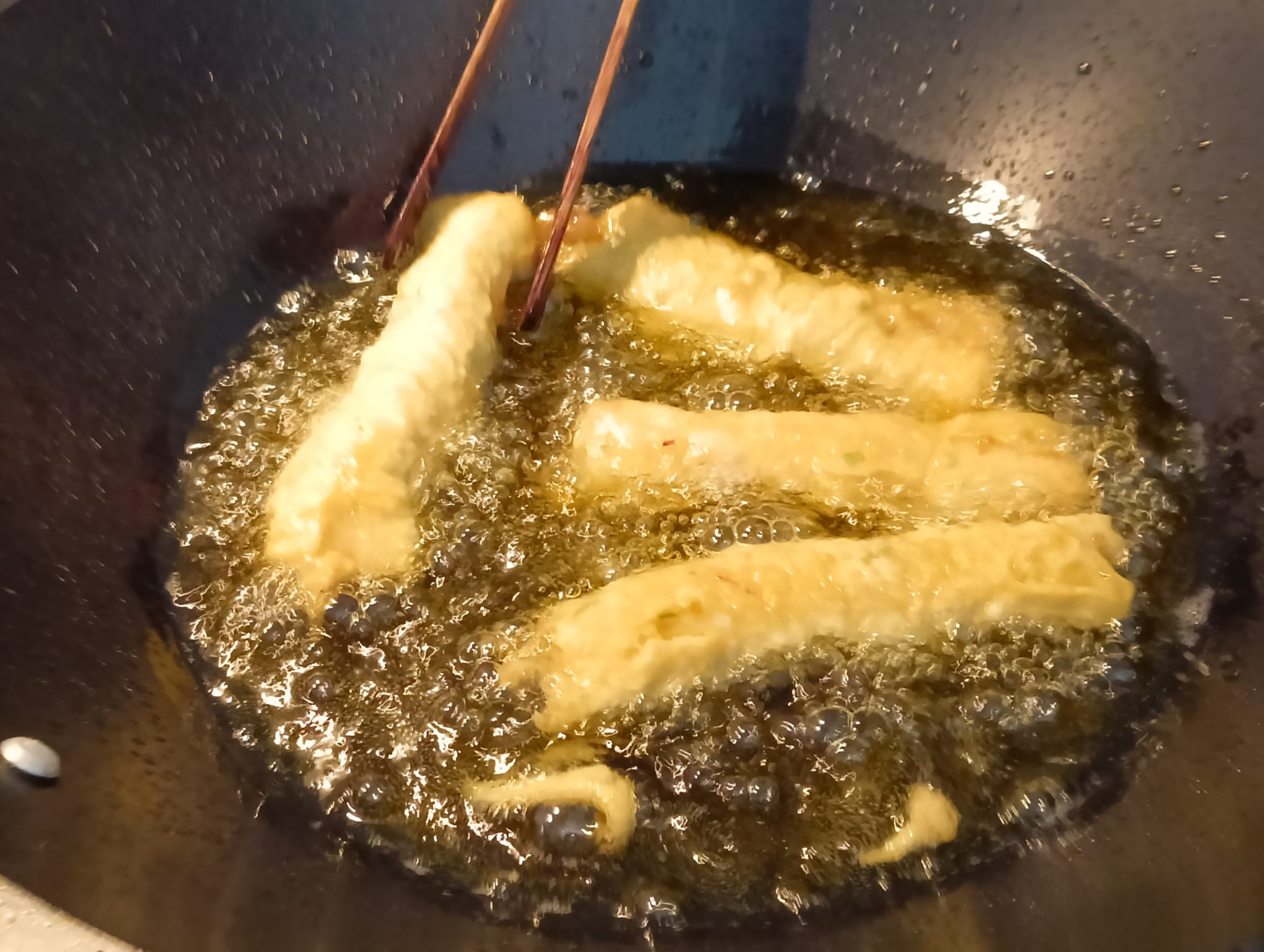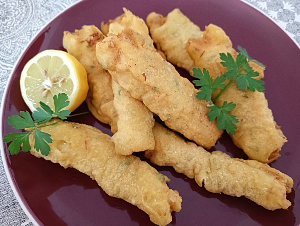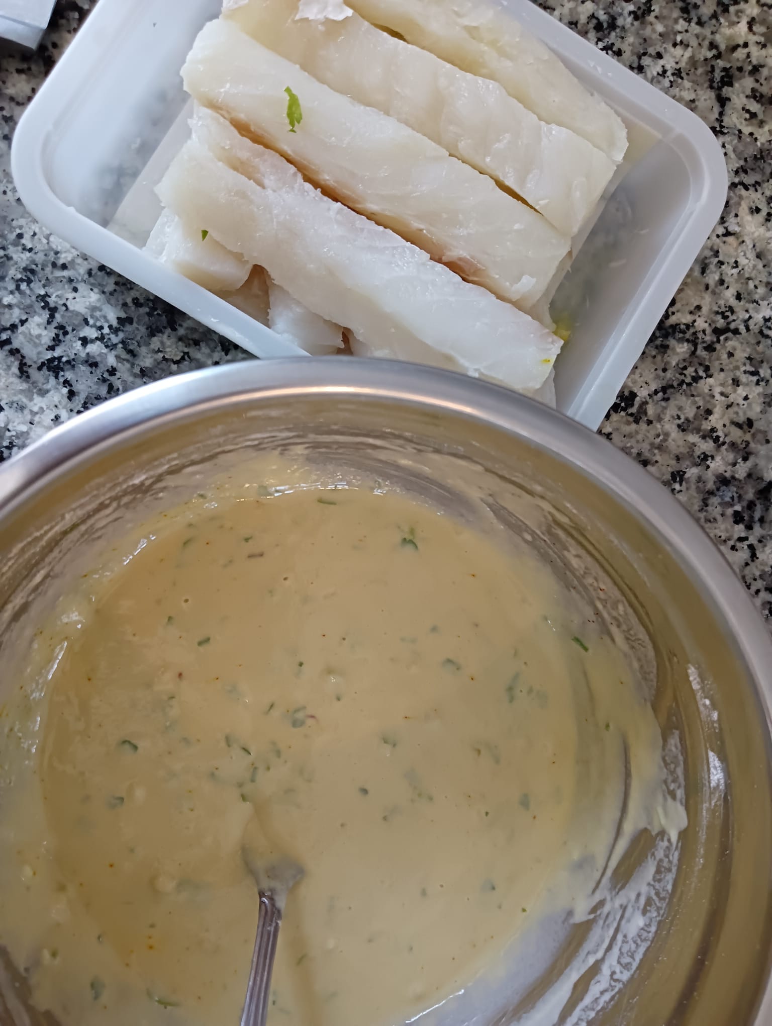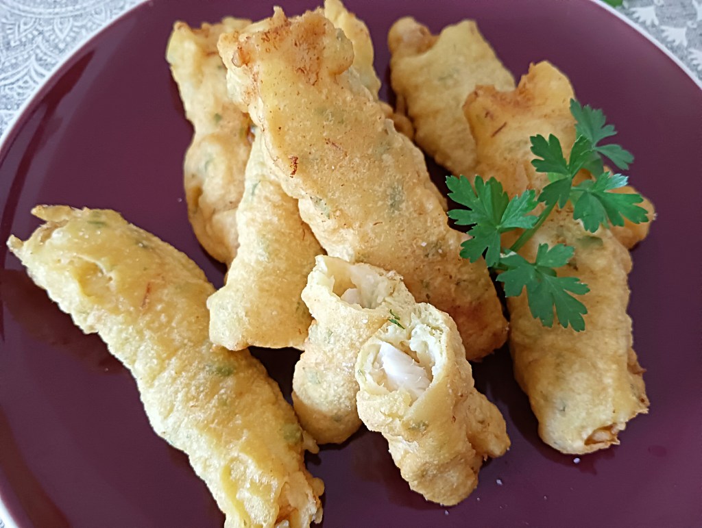 -sellamos las tiras de bacalao con un poco de harina y luego las colocamos en la masa que hemos preparado, antes de llevar a la sartén para freír