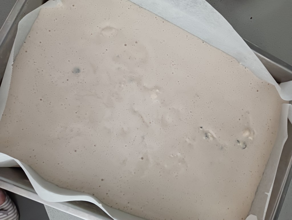 -forramos un molde con papel de horno y extendemos el relleno, que dejamos en el congelador al menos 5 horas para que coja consistencia (yo he utilizado una bandeja rectangular grande, para que luego sea fácil cortar porciones con el cortador y no tenga mucho grosor)