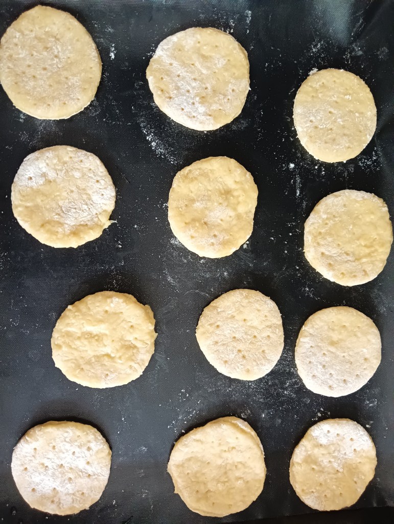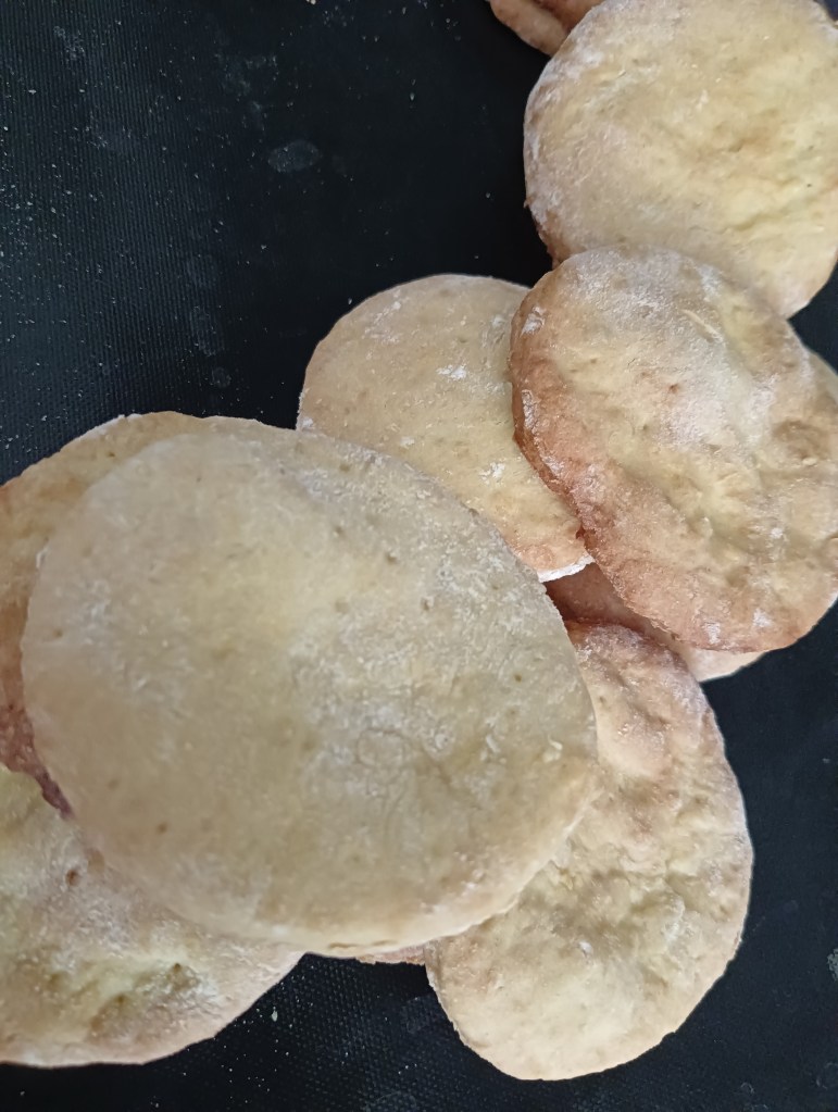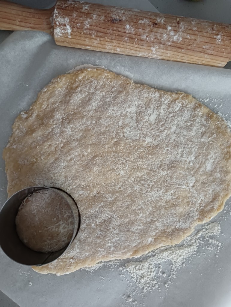 -cuando la masa tenga consistencia, la enharinamos un poco para que sea más fácil trabajarla y la estiramos con un rodillo. Con la ayuda de un cortador redondo, les damos forma y colocamos en la bandeja del horno