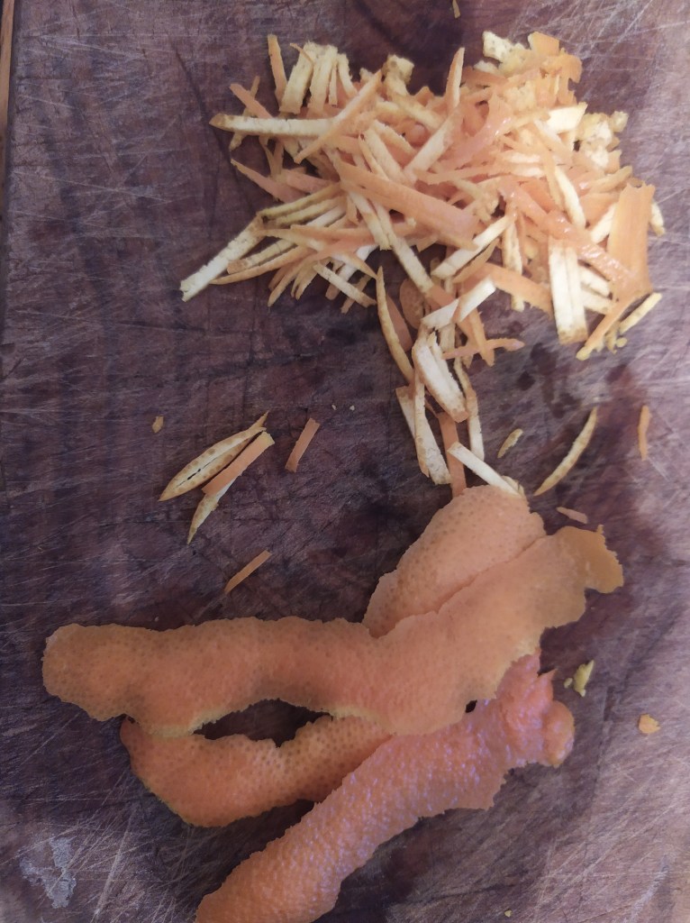 -picamos finamente la piel que hemos retirado de las naranjas y reservamos