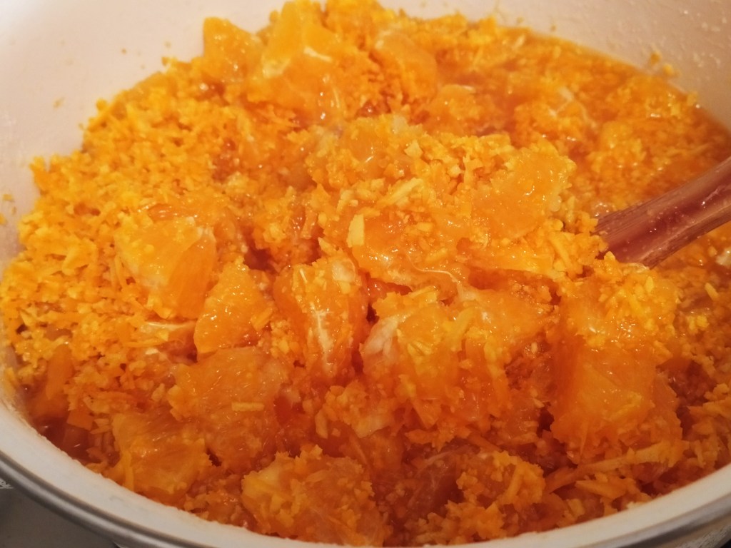 -una vez escurridas, mezclamos las pieles con las naranjas y el azúcar y volvemos a llevar al fuego (medio) durante una hora y vamos removiendo para que no se pegue