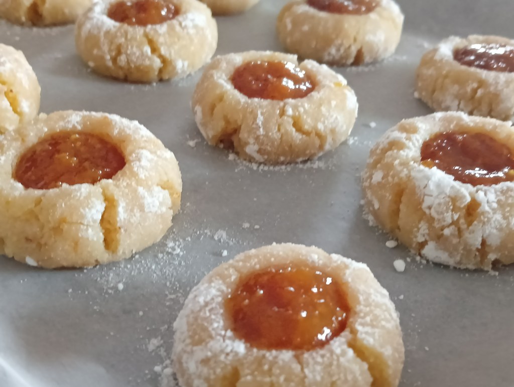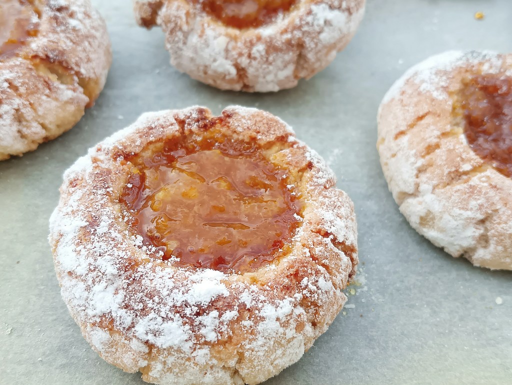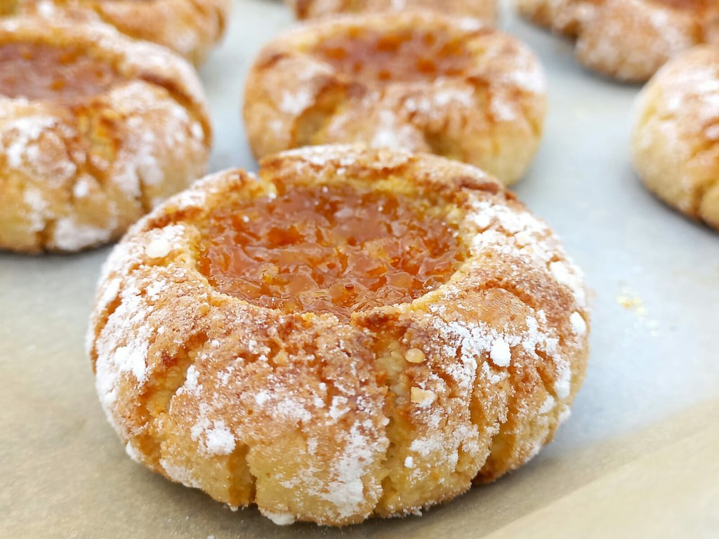 Hace tiempo que mi madre tenía guardada esta receta para hacerla juntas. Cuando preparamos merlada de naranja de nuestra cosecha, me dijo que con uno de los botes haríamos una especie de galleta de almendra rellena. De textura es como un mazapán, ya que utilizamos harina de almendra, no de trigo ni de fuerza. Es una masa que se trabaja muy bien, no es nada pegajosa y se le puede dar forma con las manos fácilmente. Nosotras hemos hecho bolitas, que luego con un tapón de corcho las hemos aplanado y hecho un hueco en el centro para poner la mermelada. Es una receta que no lleva gluten, así que es apta para celíacos. Nos han encantado, tanto de textura como de sabor, además quedan preciosas. Con estas cantidades salen 12 unidades.