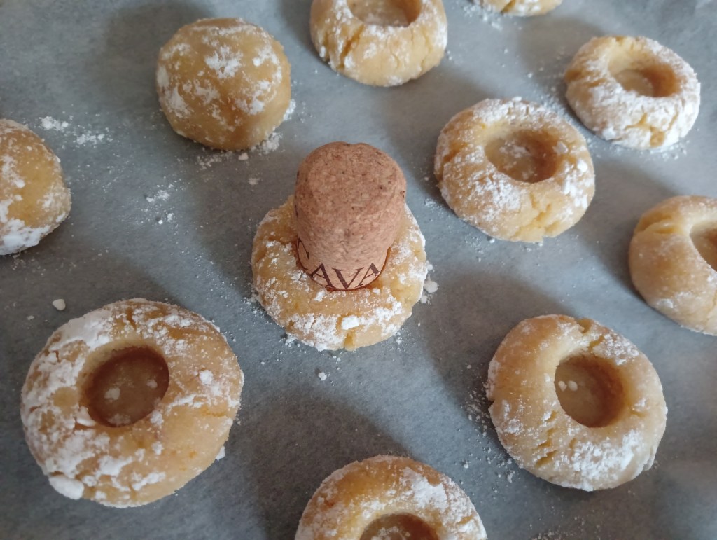 -con la ayuda de un tapón de corcho o una cucharita, chafamos las bolitas y hacemos un hueco en el centro para luego añadir la mermelada de naranja