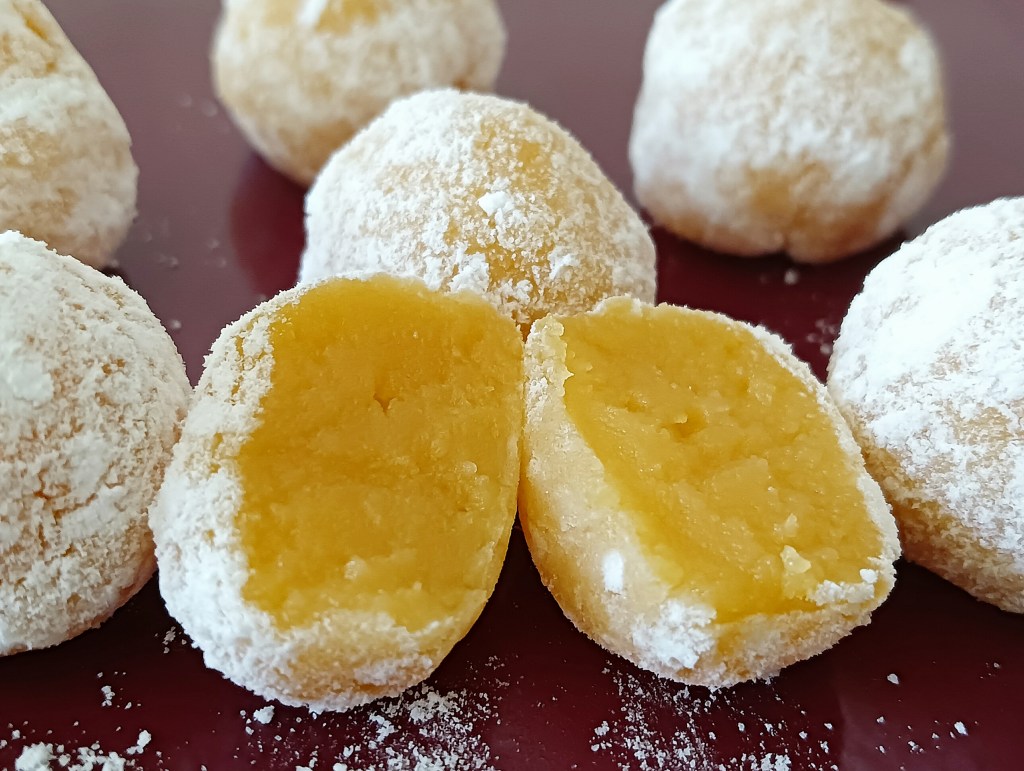 -colocamos azúcar glas en un bol y nos ponemos un poco en las manos para hacer bolitas con la masa, que luego las rebozamos en azúcar glas y las colocamos en un envoltorio o directamente en un plato