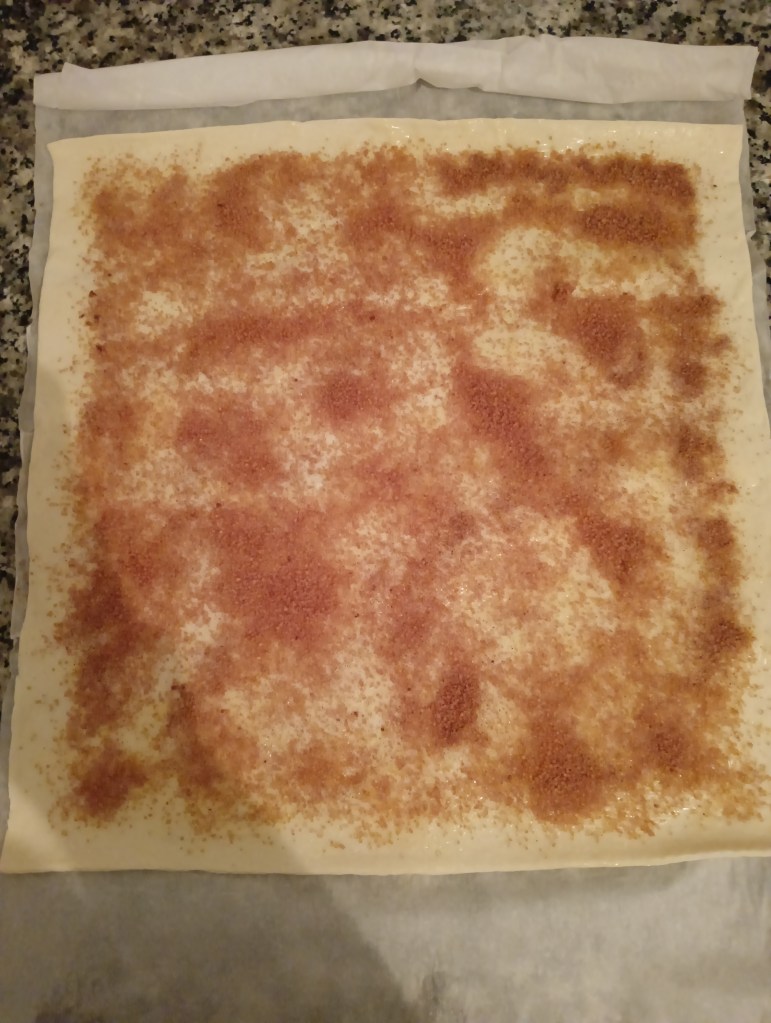 -estiramos una lámina de hojaldre rectangular y vertemos por encima el relleno escogido (yo he utilizado mantequilla derretida, azúcar moreno y canela, pero podéis optar por Nutella, crema de avellanas o algún ingrediente salado: jamón dulce, bacon…)