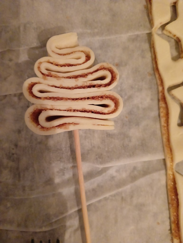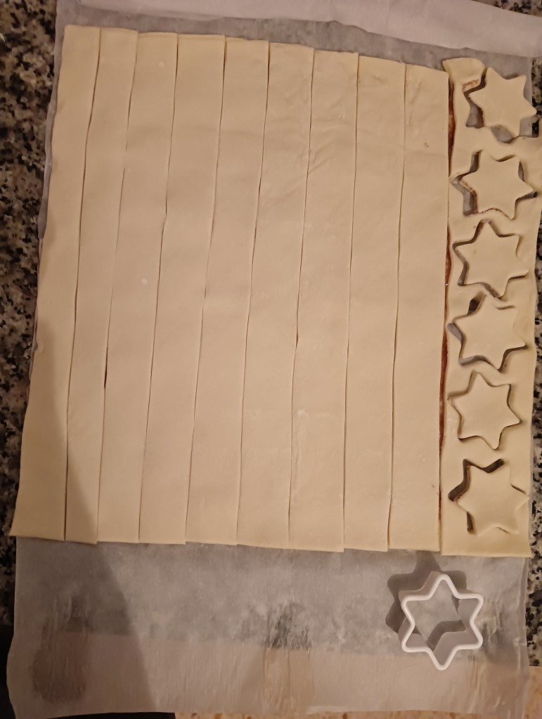 -colocamos la otra lámina de hojaldre encima y recortamos tiras para hacer la forma de los árboles. Reservamos una tira para cortar estrellas con un cortador si tenemos (las estrellas las sellamos con un tenedor para que no se abran)