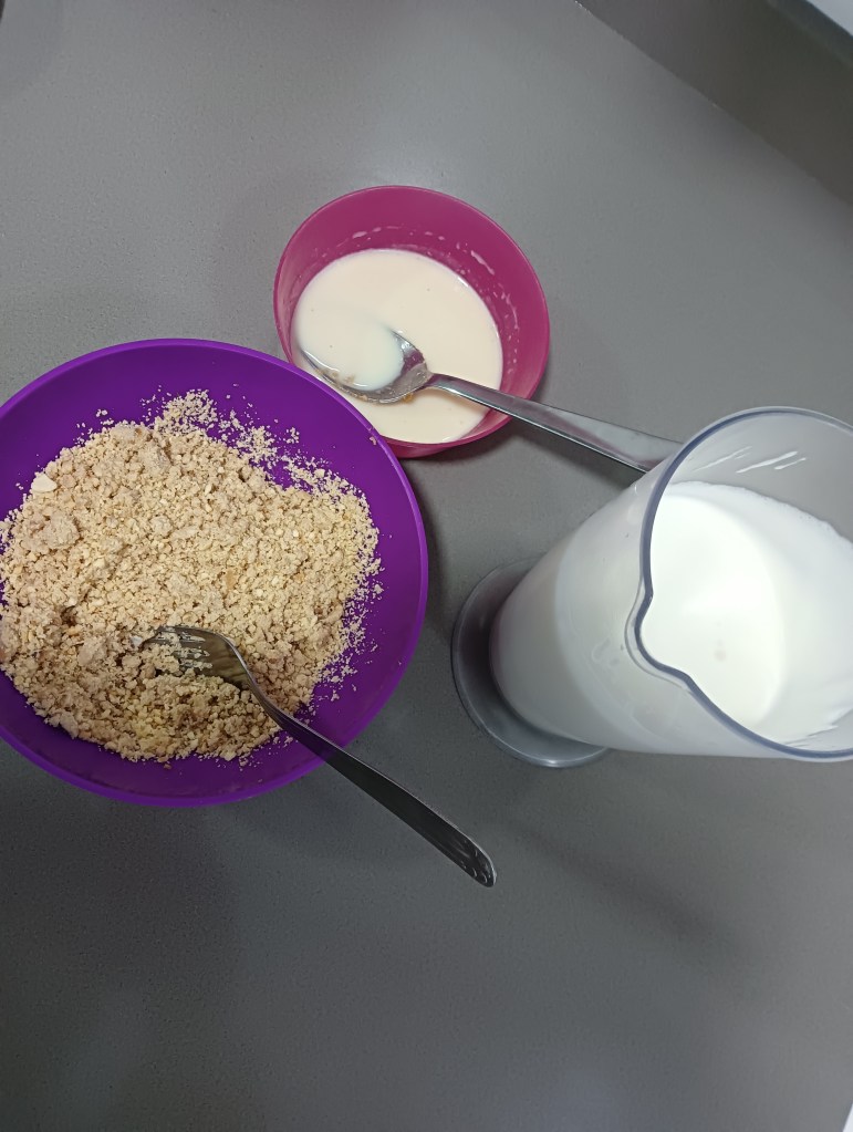 -por otro lado, picamos las avellanas y las mezclamos con los polvorones. Trituramos la mezcla para que no queden grumos y mezclamos finalmente con la leche evaporada o la nata que hemos montado y con la parte que tenemos con las gelatinas (si queda grumosa, podemos volver a triturar)