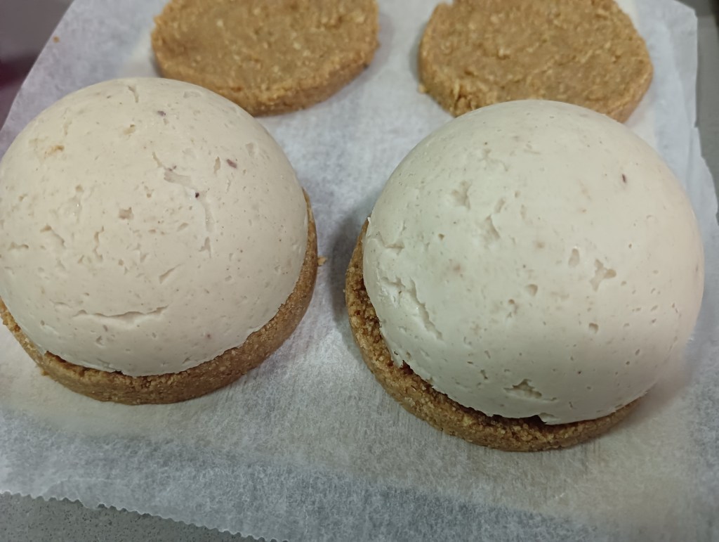 -a la hora de servir, desmoldamos las semiesferas y las colocamos encima de la base